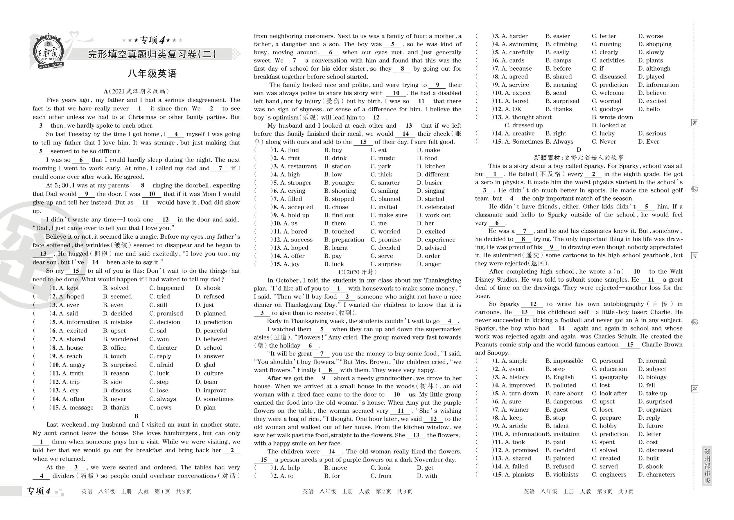 王朝霞期末专项卷——完形填空真题归类复习卷(二)八年级上册英语(人教版)【4】