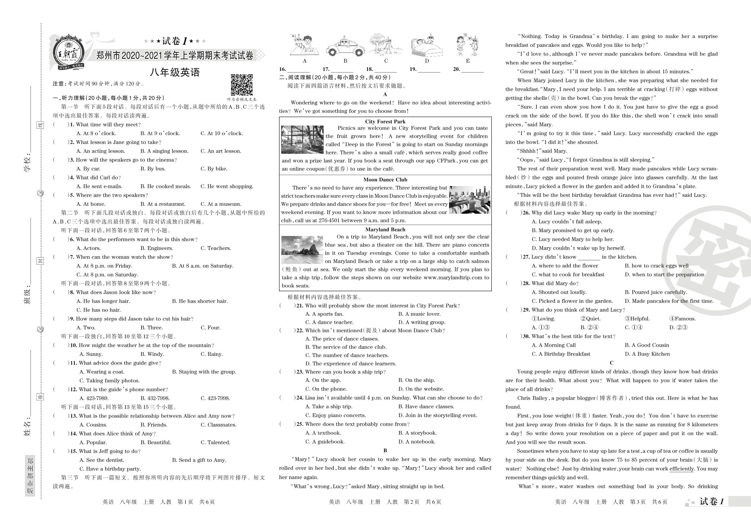 郑州市2020~2021学年上学期期末考试试卷八年级英语(人教版)【1】