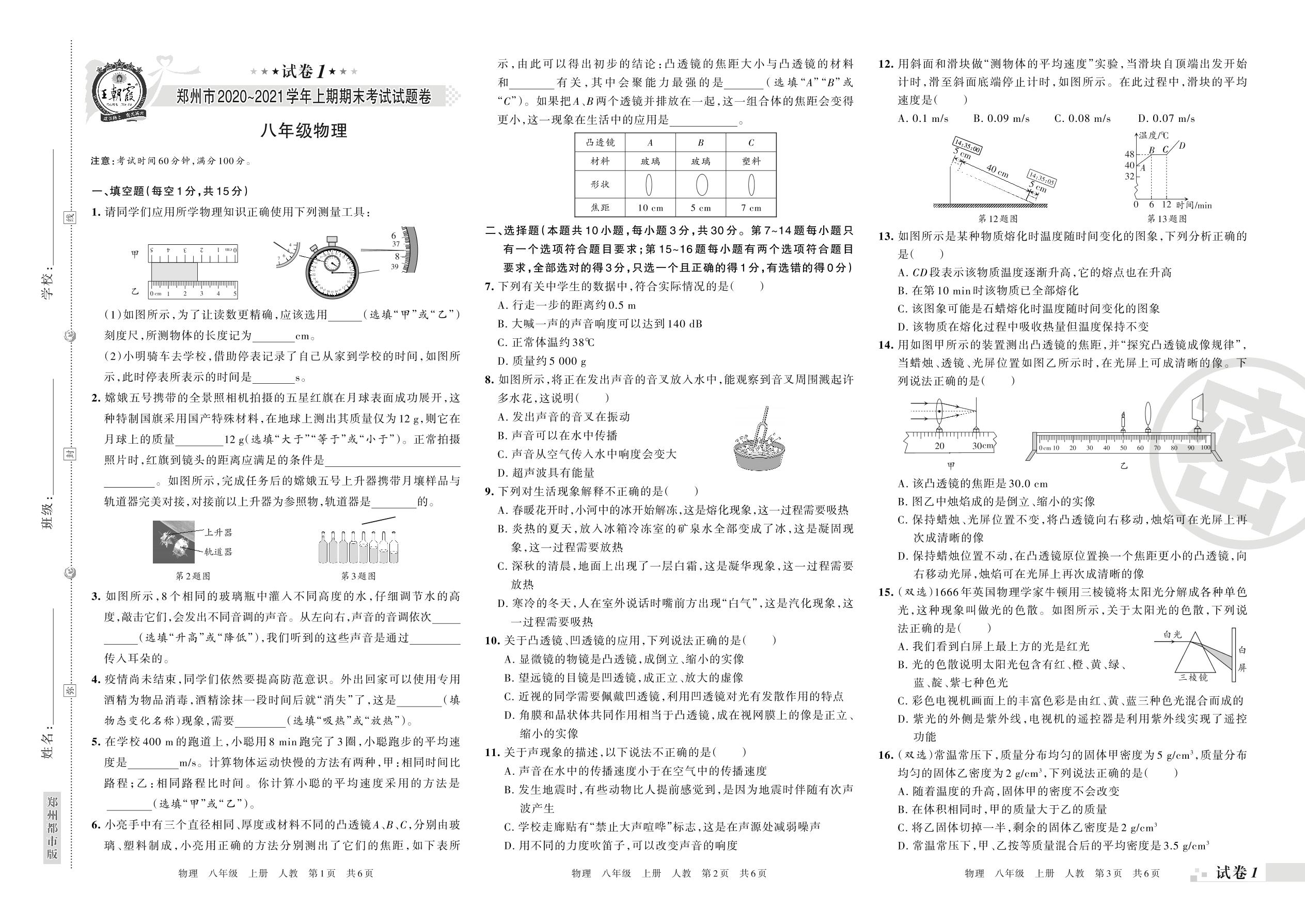 郑州市2020~2021学年上期期末考试试题卷八年级物理(人教版)【1】