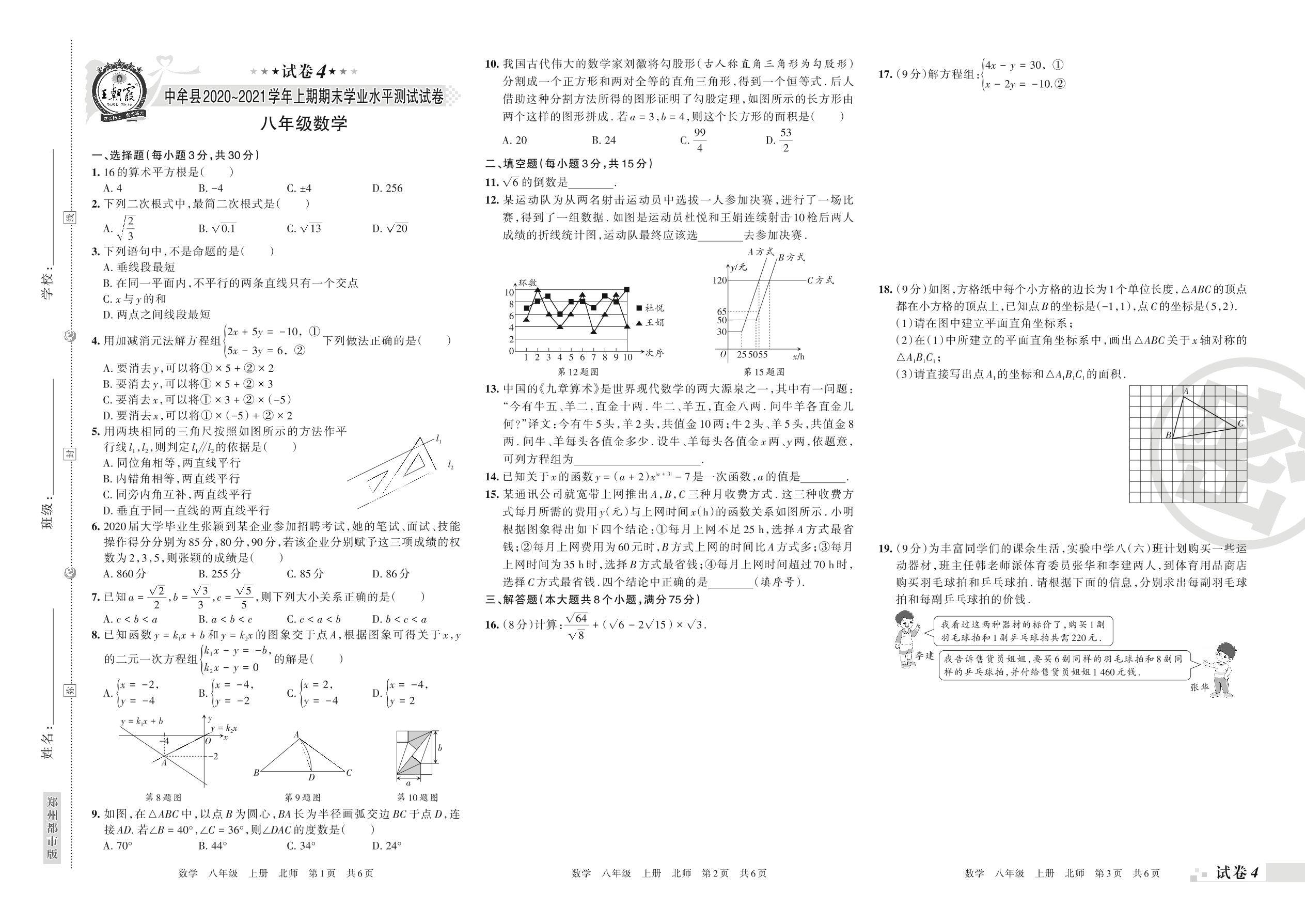 中牟县2020~2021学年上期期末学业水平测试试卷八年级数学(北师版)【4】