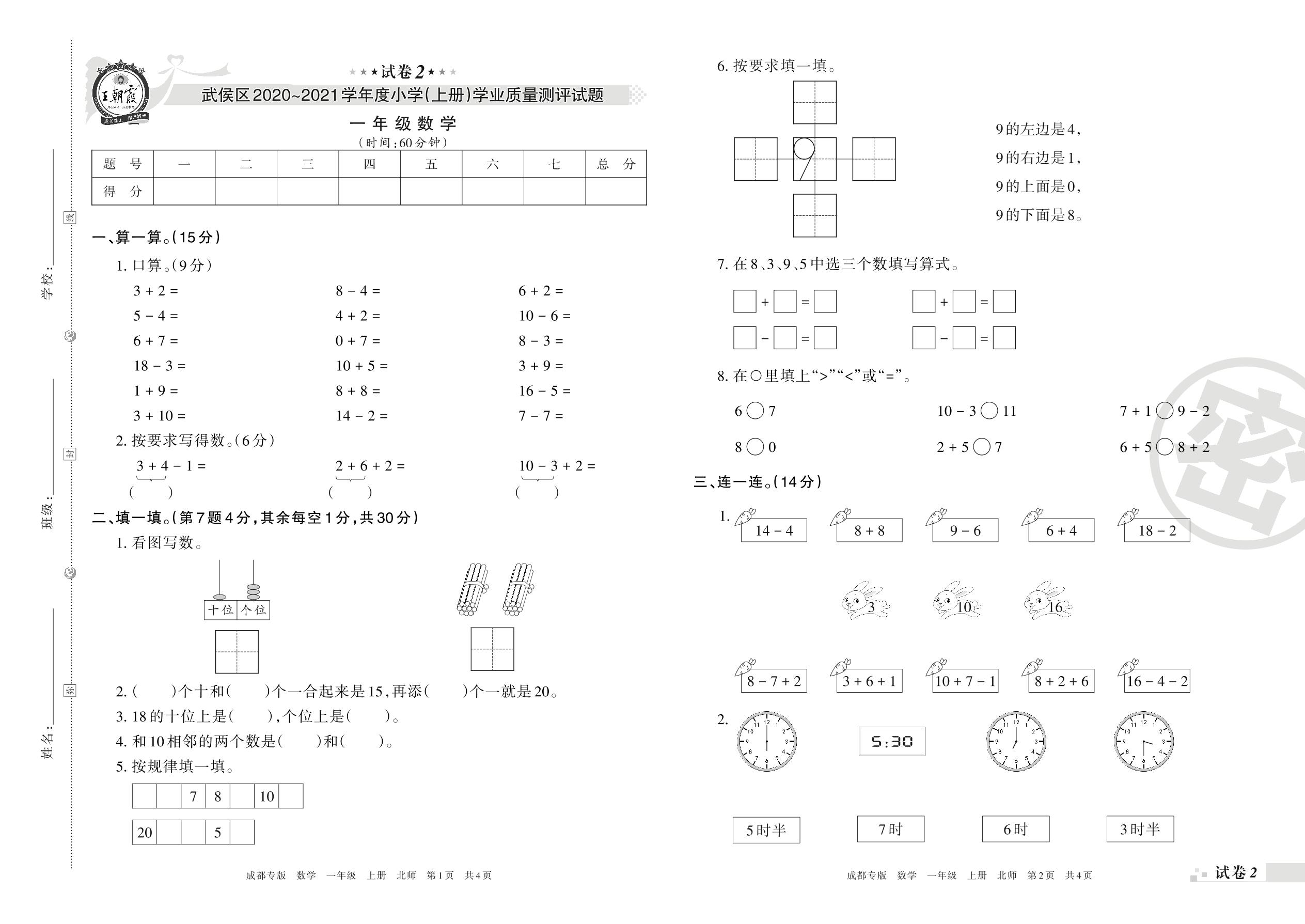武侯区2020~2021学年度小学(上册)学业质量测评试题一年级数学(北师版)【2】