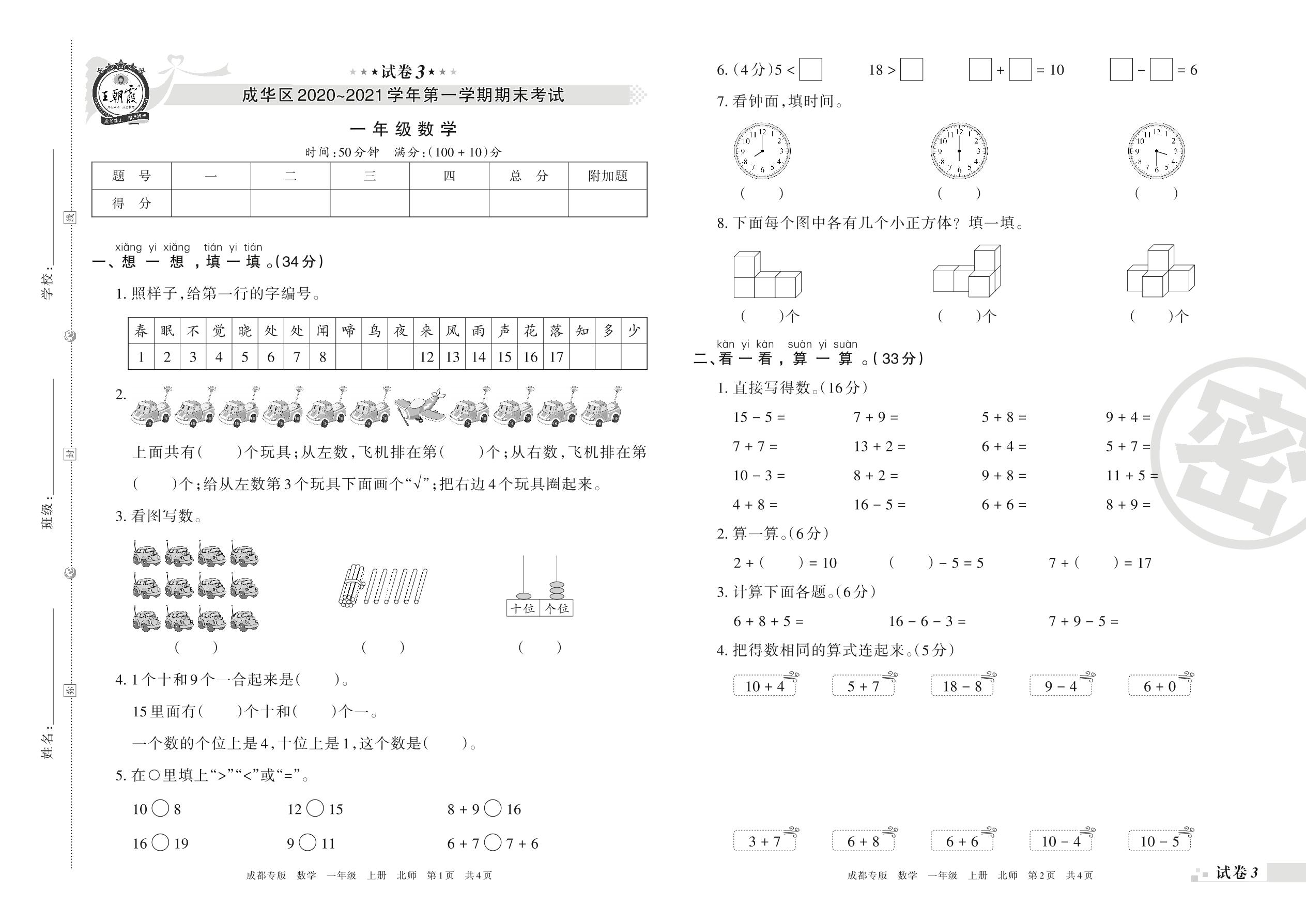 成华区2020~2021学年第一学期期末考试一年级数学(北师版)【3】