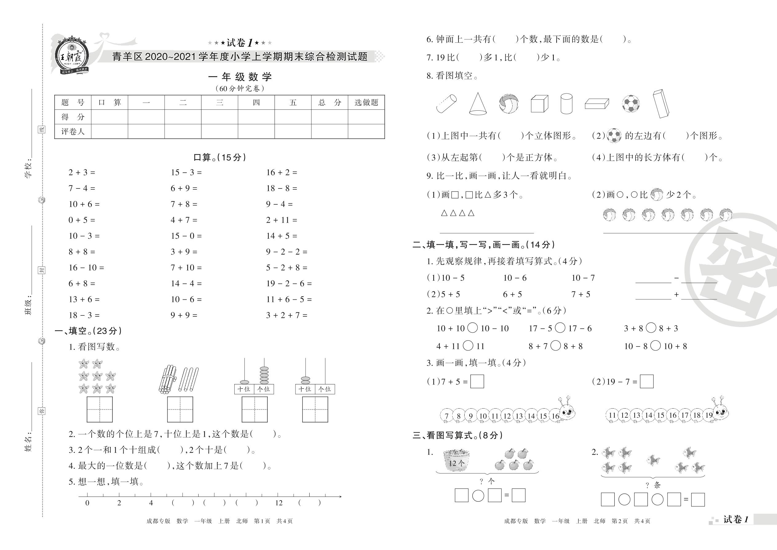 青羊区2020~2021学年度小学上学期期末综合检测试题一年级数学(北师版)【1】