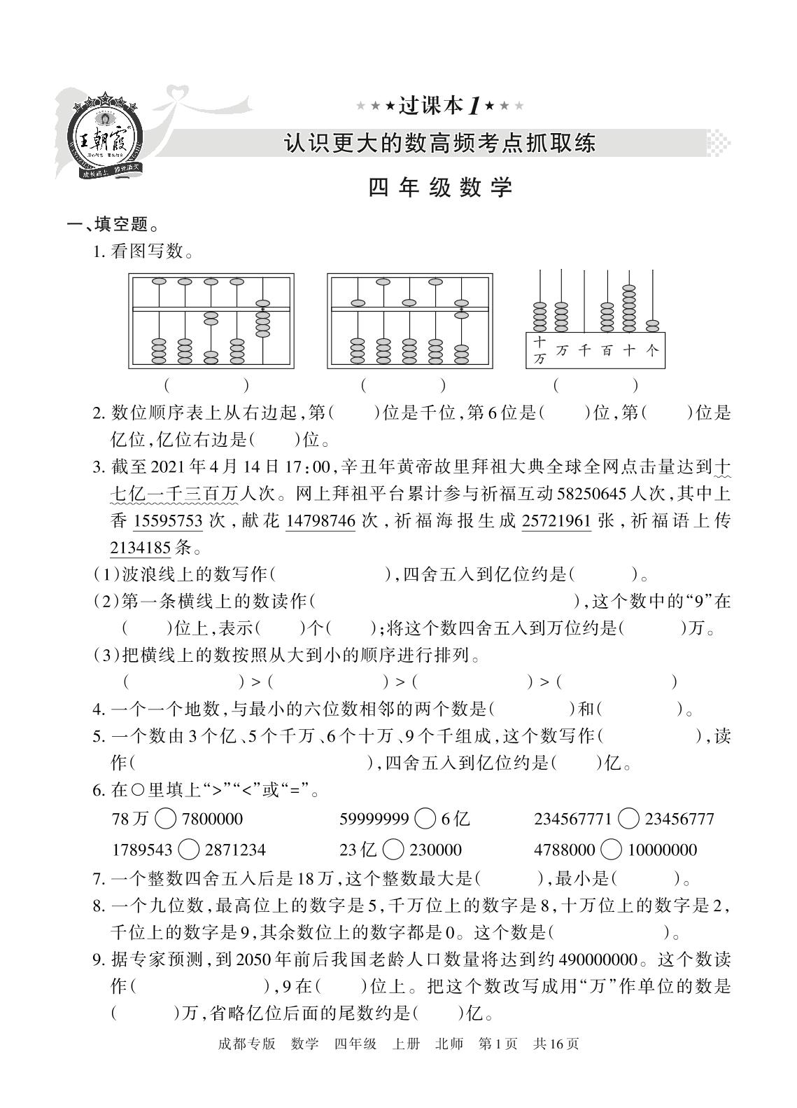 王朝霞期末过课本——认识更大的数高频考点抓取练四年级上册数学(北师版)_R211120150910055【1】