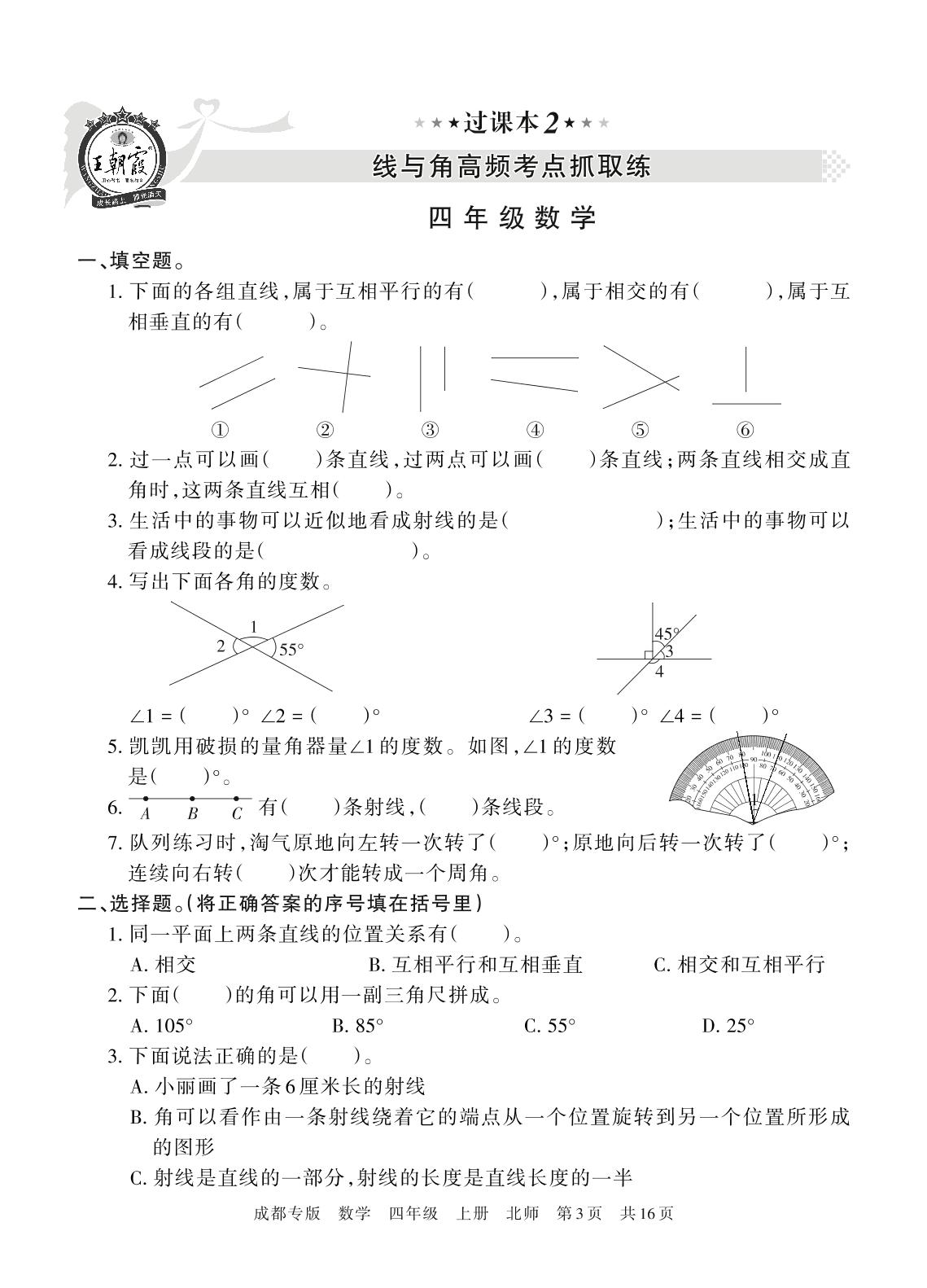 王朝霞期末过课本——线与角高频考点抓取练四年级上册数学(北师版)_R211120150910582【2】