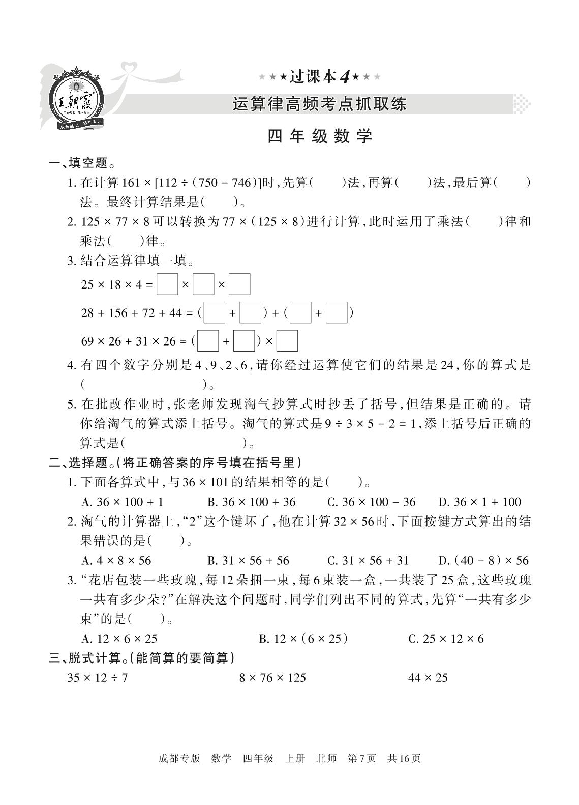 王朝霞期末过课本——运算律高频考点抓取练四年级上册数学(北师版)_R211120150910298【4】
