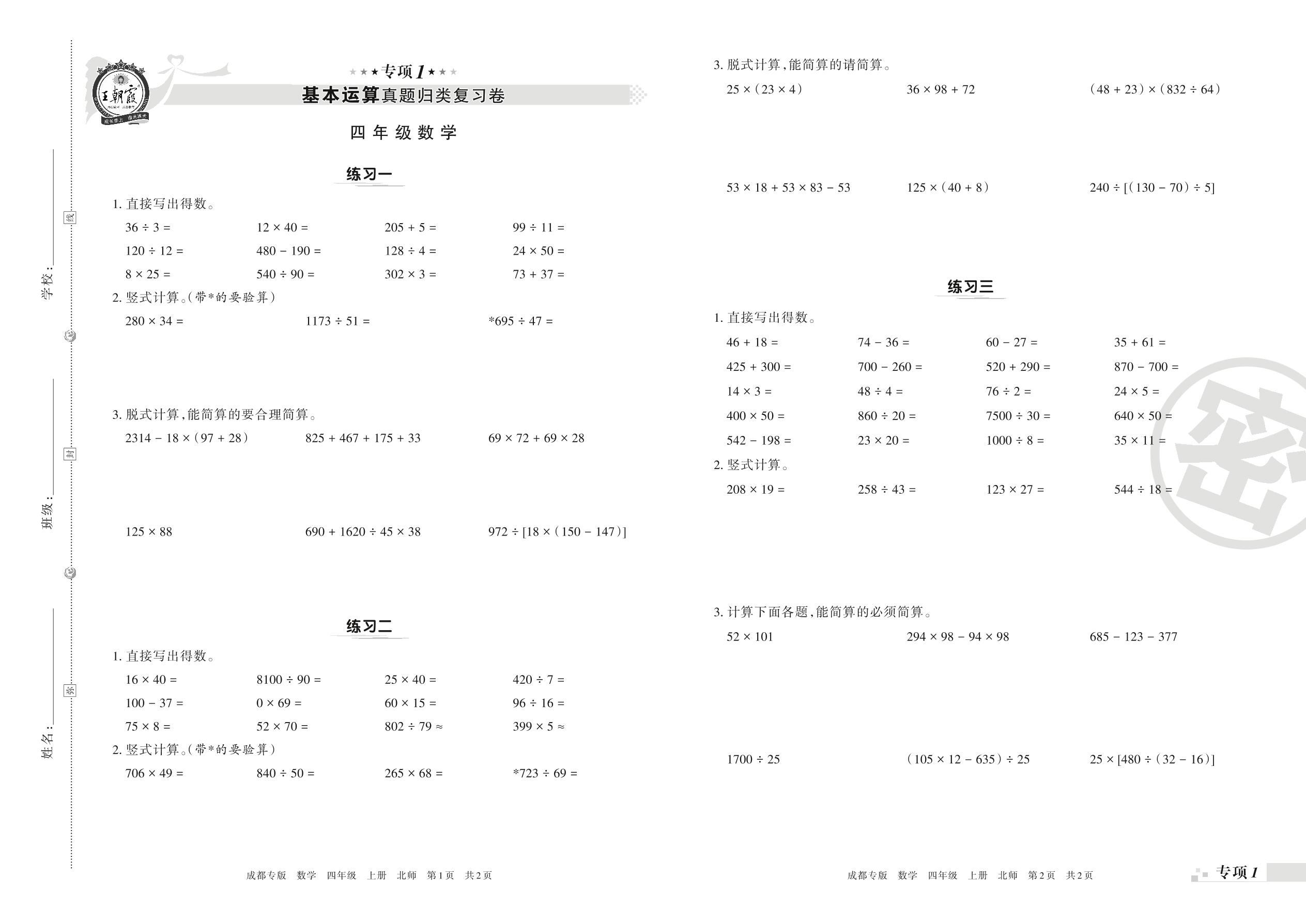 王朝霞期末专项卷——基本运算真题归类复习卷四年级上册数学(北师版)【1】