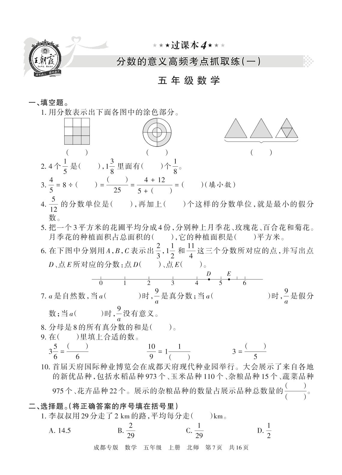 王朝霞期末过课本——分数的意义高频考点抓取练(一)五年级上册数学(北师版)_R211120151235960【4】