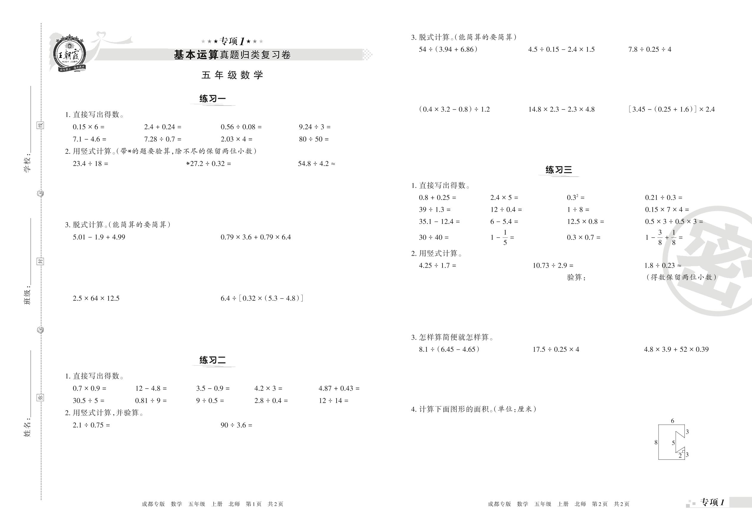 王朝霞期末专项卷——基本运算真题归类复习卷五年级上册数学(北师版)【1】