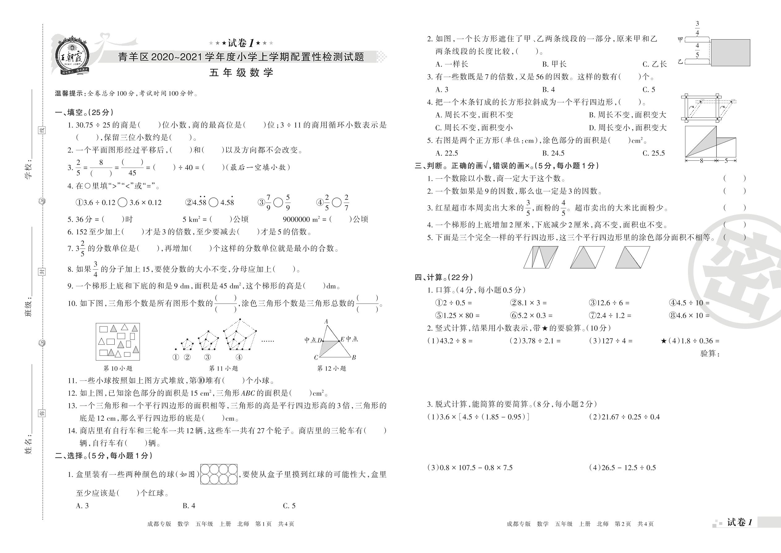 青羊区2020~2021学年度小学上学期配置性检测试题五年级数学(北师版)【1】