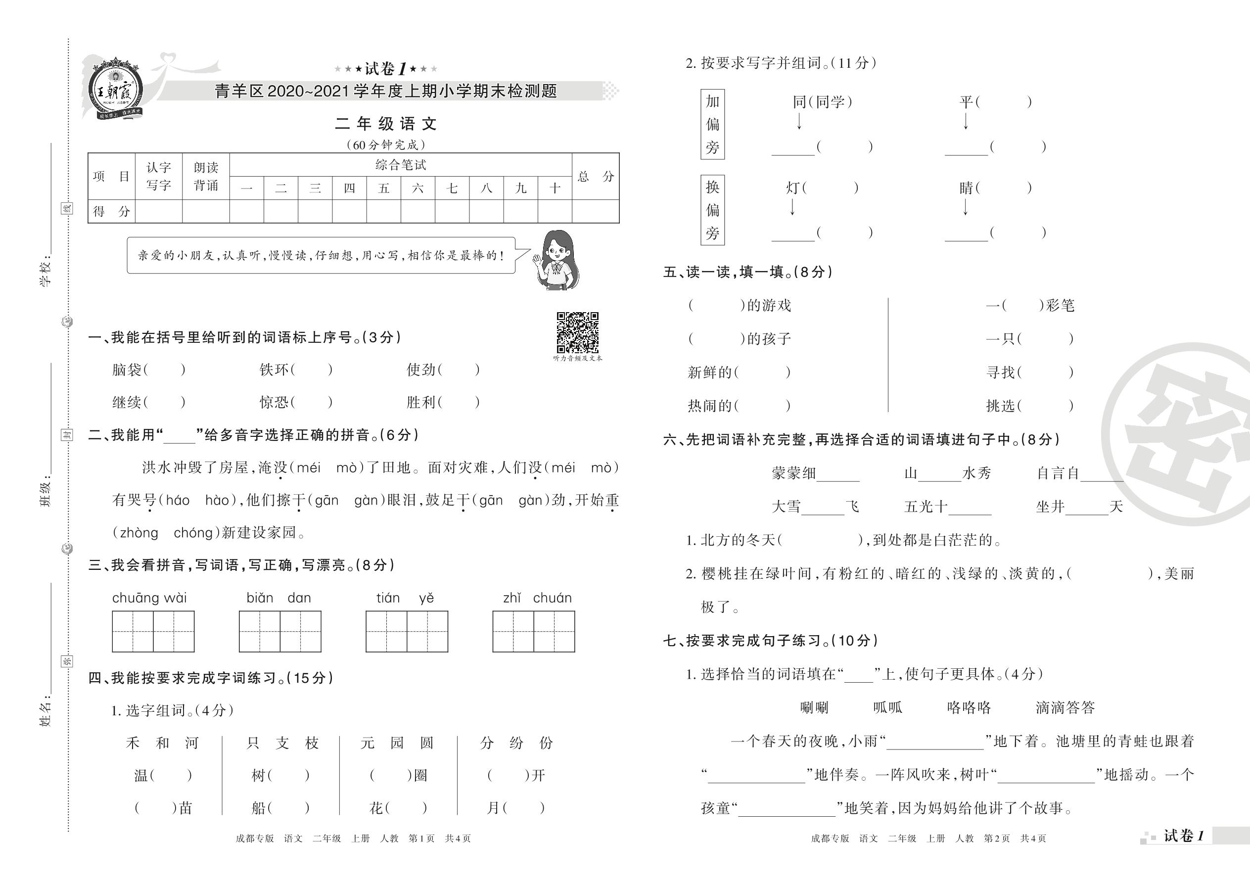 青羊区2020~2021学年度上期小学期末检测题二年级语文(人教版)【1】