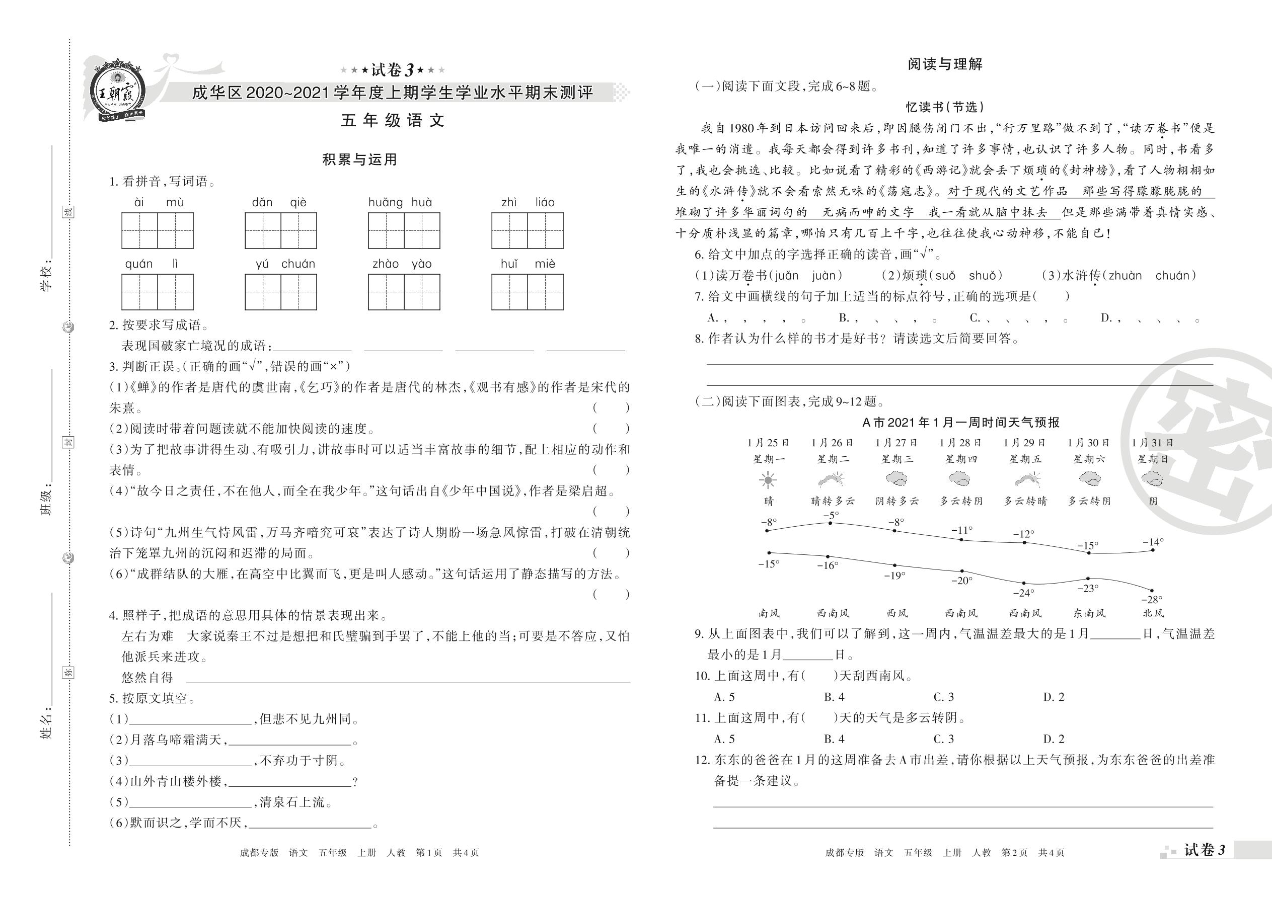 成华区2020~2021学年度上期学生学业水平期末测评五年级语文(人教版)【3】