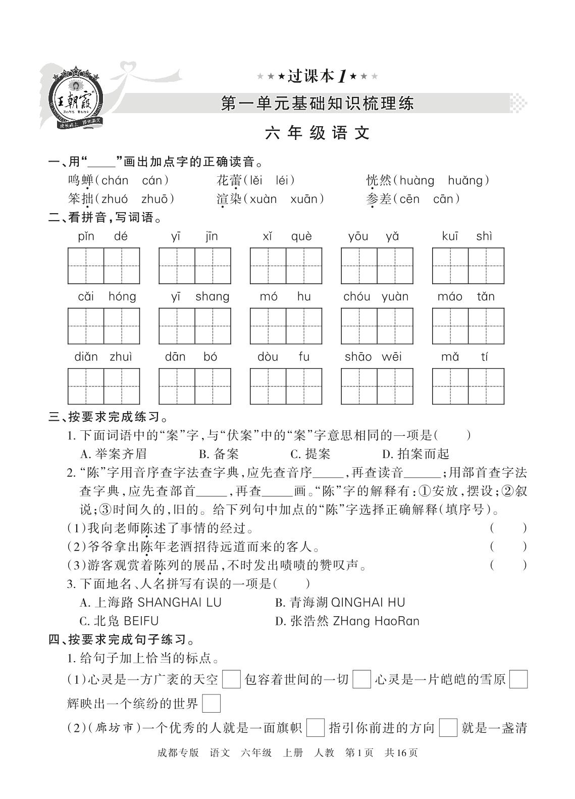 王朝霞期末过课本——第一单元基础知识梳理练六年级上册语文(人教版)_R211120154536923【1】