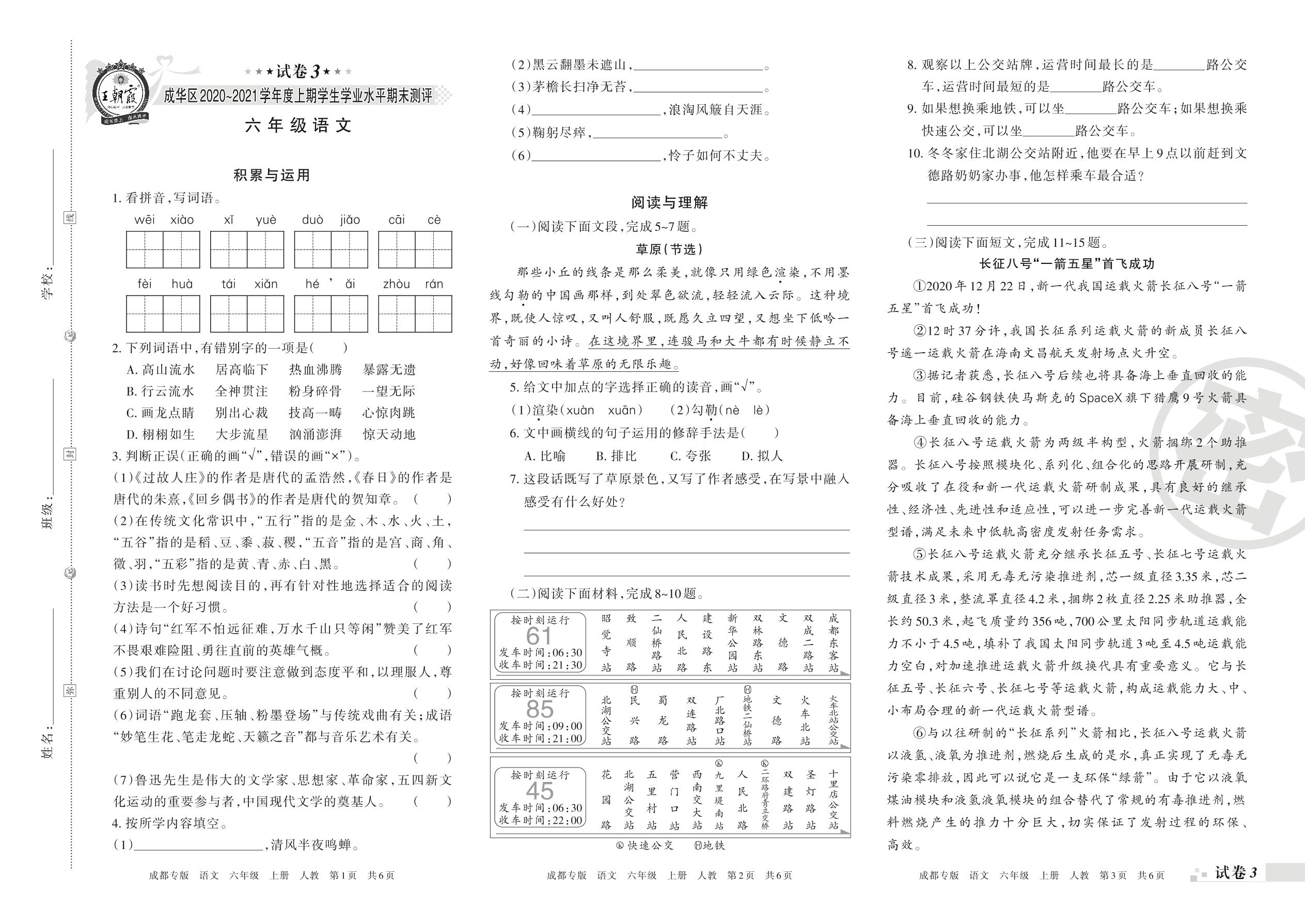 成华区2020~2021学年度上期学生学业水平期末测评六年级语文(人教版)【3】