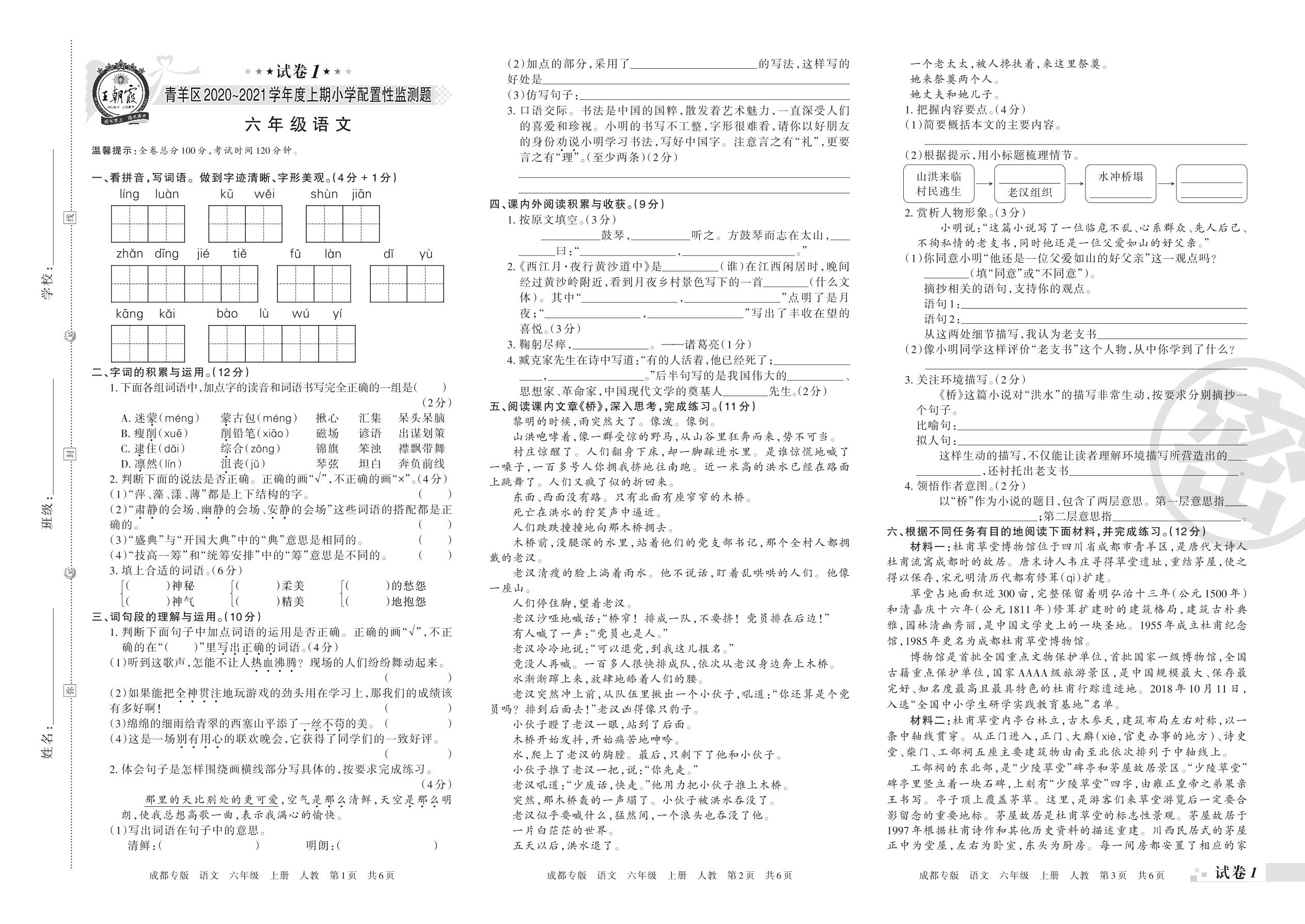 青羊区2020~2021学年度上期小学配置性监测题六年级语文(人教版)【1】