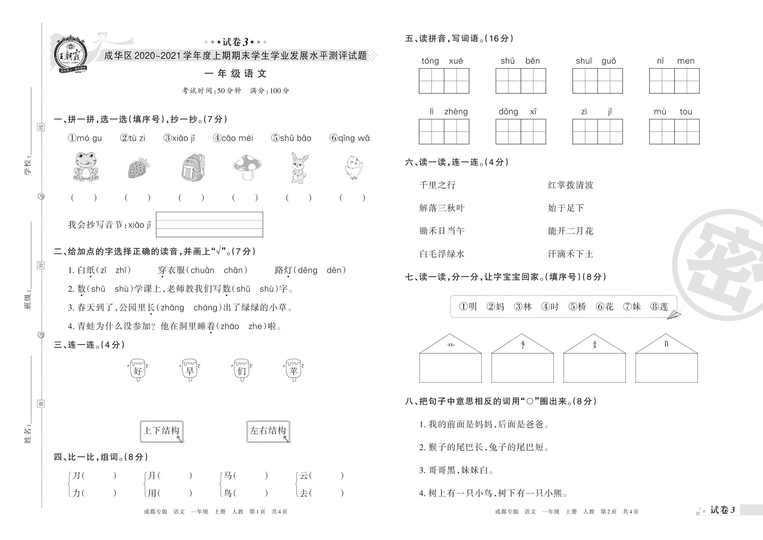 成华区2020~2021学年度上期期末学生学业发展水平测评试题一年级语文(人教版)【3】