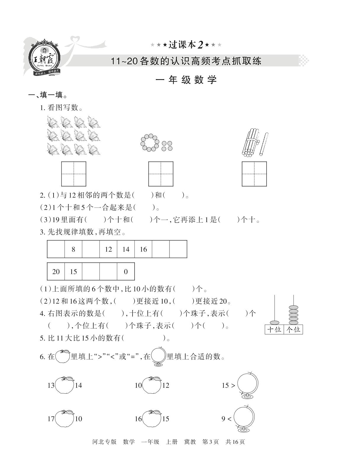 王朝霞期末过课本——11~20各数的认识高频考点抓取练一年级上册数学(冀教版)【2】