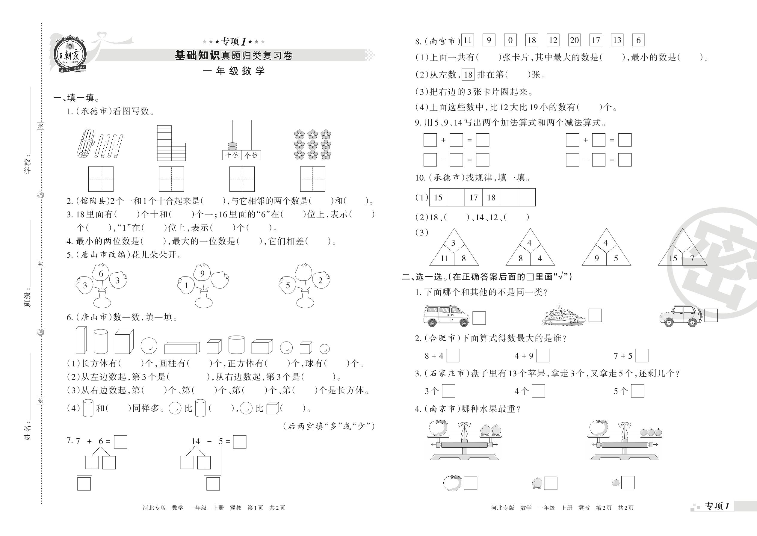 王朝霞期末专项卷——基础知识真题归类复习卷一年级上册数学(冀教版)【1】