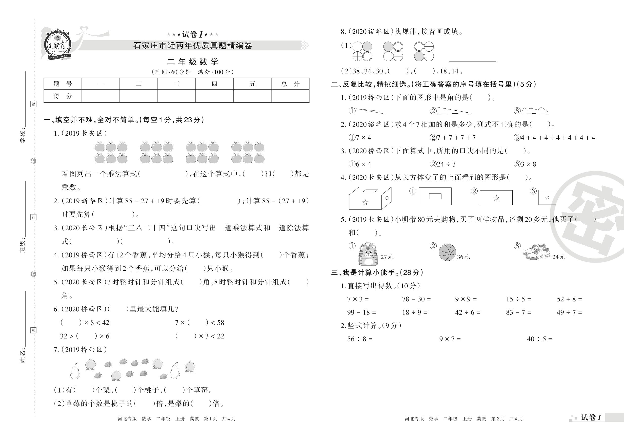 石家庄市近两年优质真题精编卷二年级上册数学(冀教版)【1】