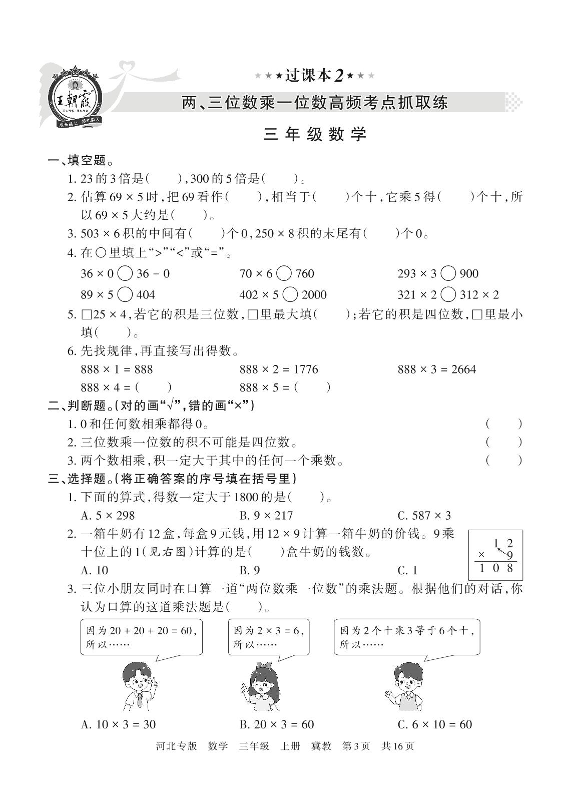 王朝霞期末过课本——两、三位数乘一位数高频考点抓取练三年级上册数学(冀教版)【2】
