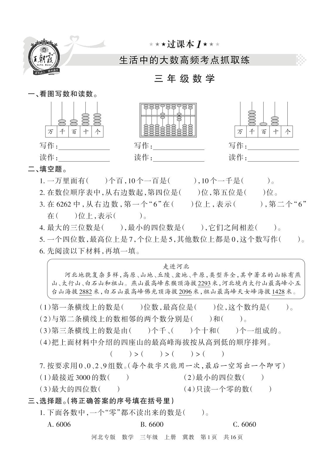 王朝霞期末过课本——生活中的大数高频考点抓取练三年级上册数学(冀教版)【1】