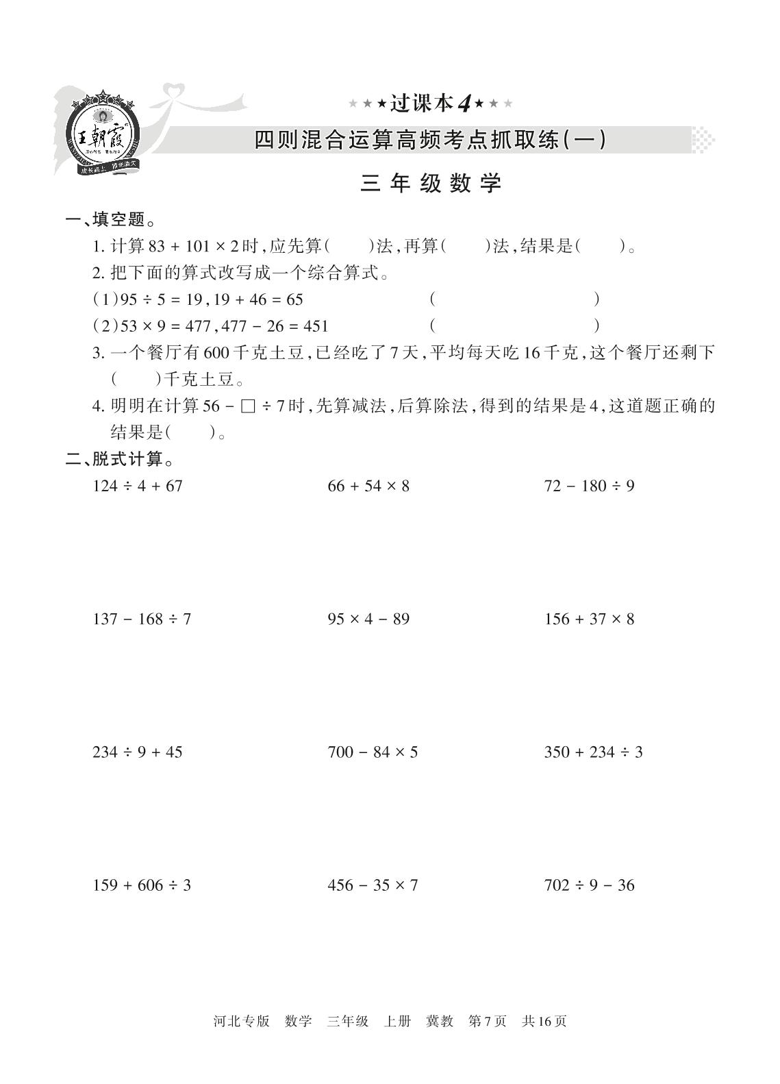 王朝霞期末过课本——四则混合运算高频考点抓取练(一)三年级上册数学(冀教版)【4】