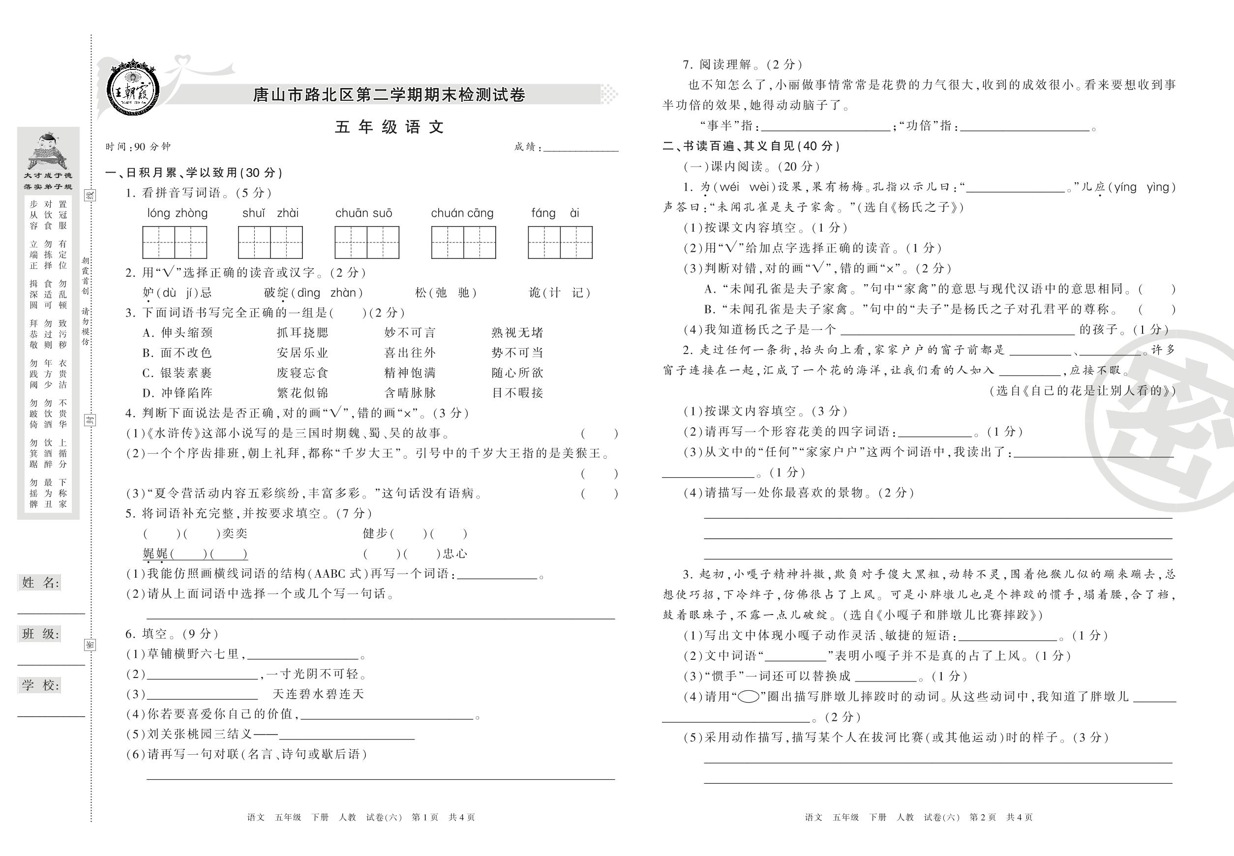 2015-2016学年第二学期唐山市路北区五年级语文试卷(人教版)【6】