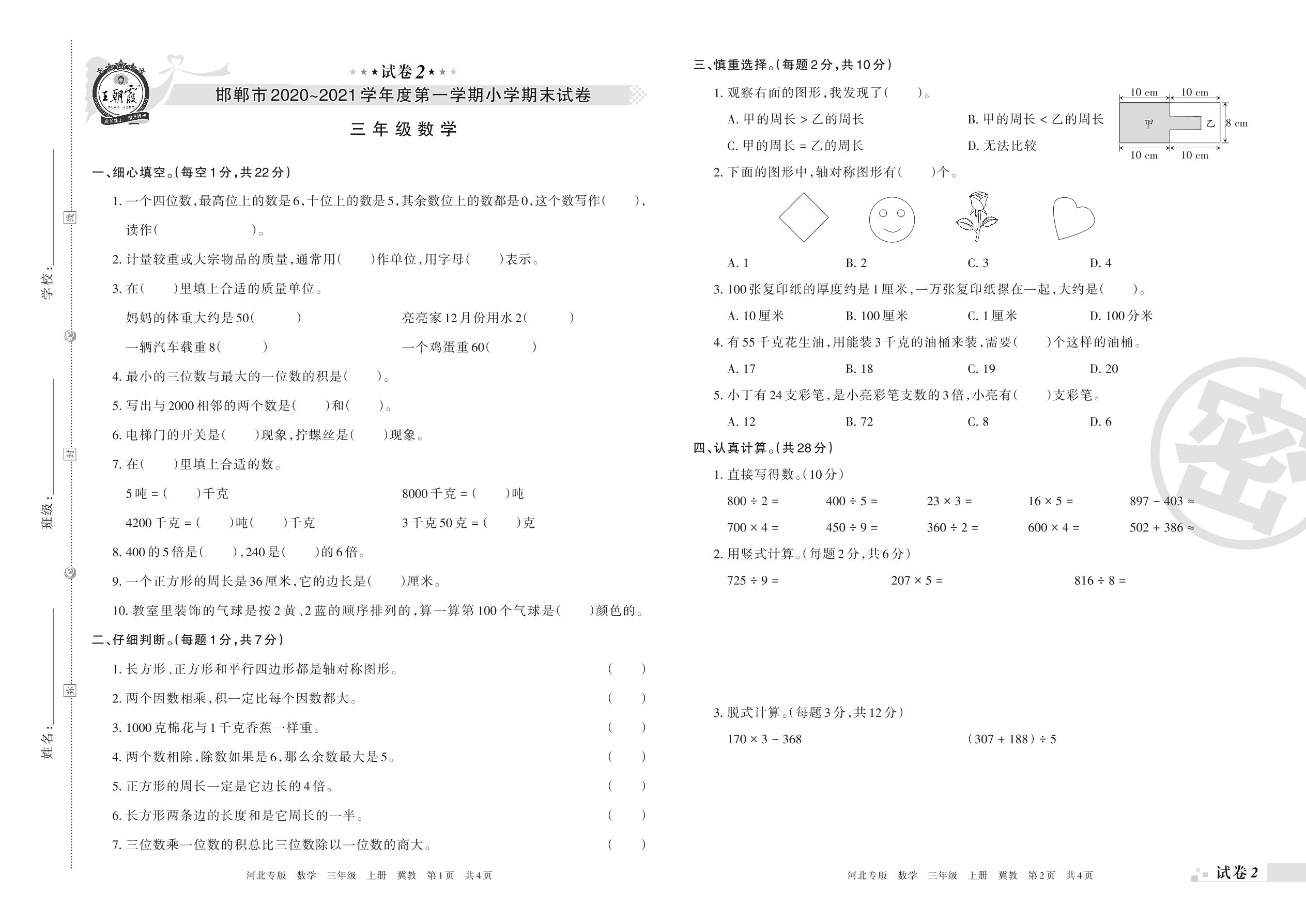 邯郸市2020~2021学年度第一学期小学期末试卷三年级数学(冀教版)【2】