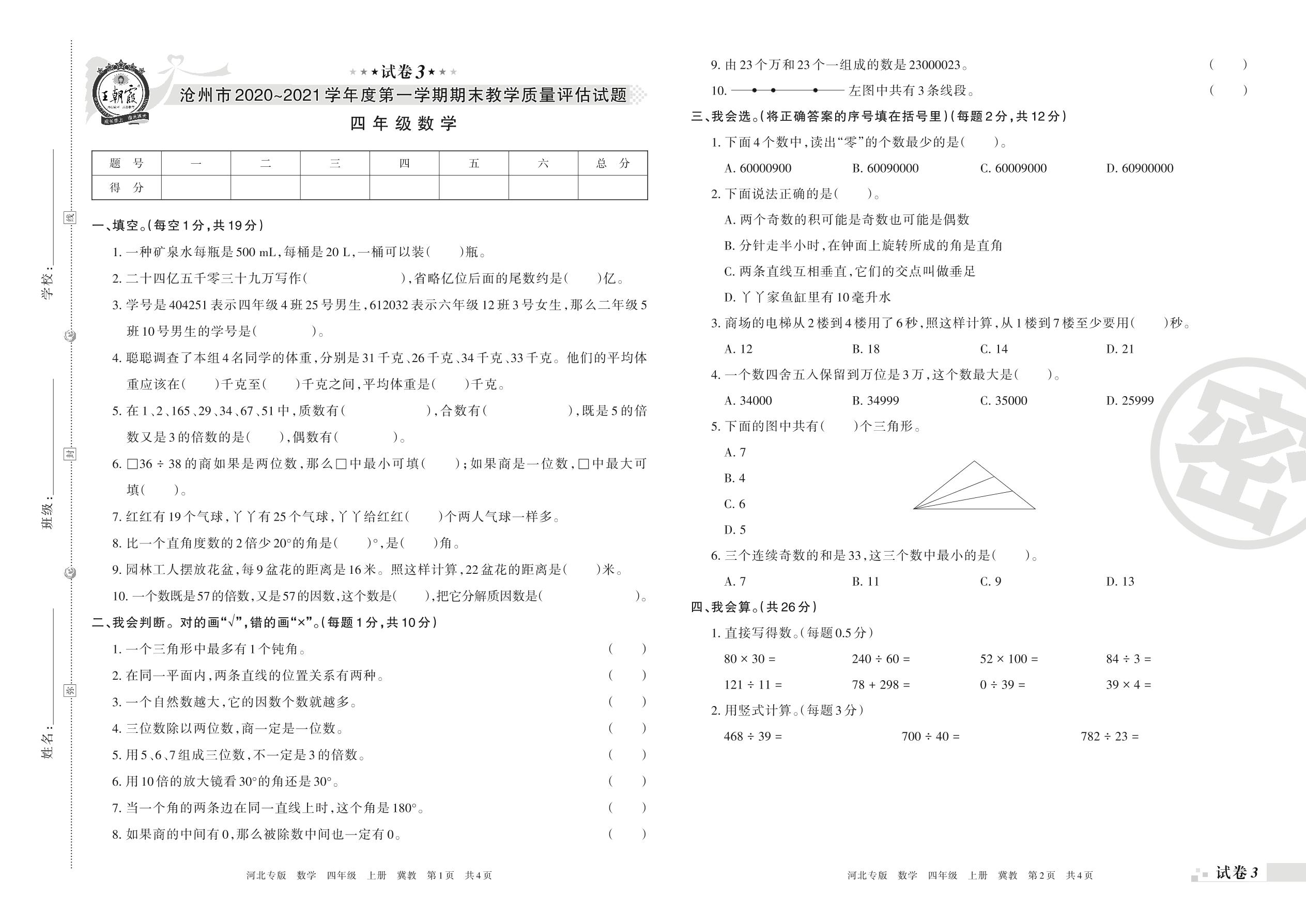 沧州市2020~2021学年度第一学期期末教学质量评估试题四年级数学(冀教版)【3】
