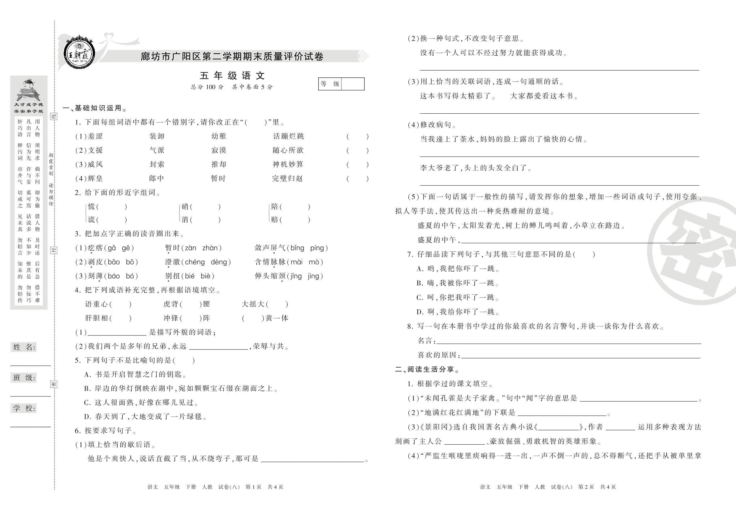 2015-2016学年第二学期廊坊市广阳区五年级语文试卷(人教版)【8】