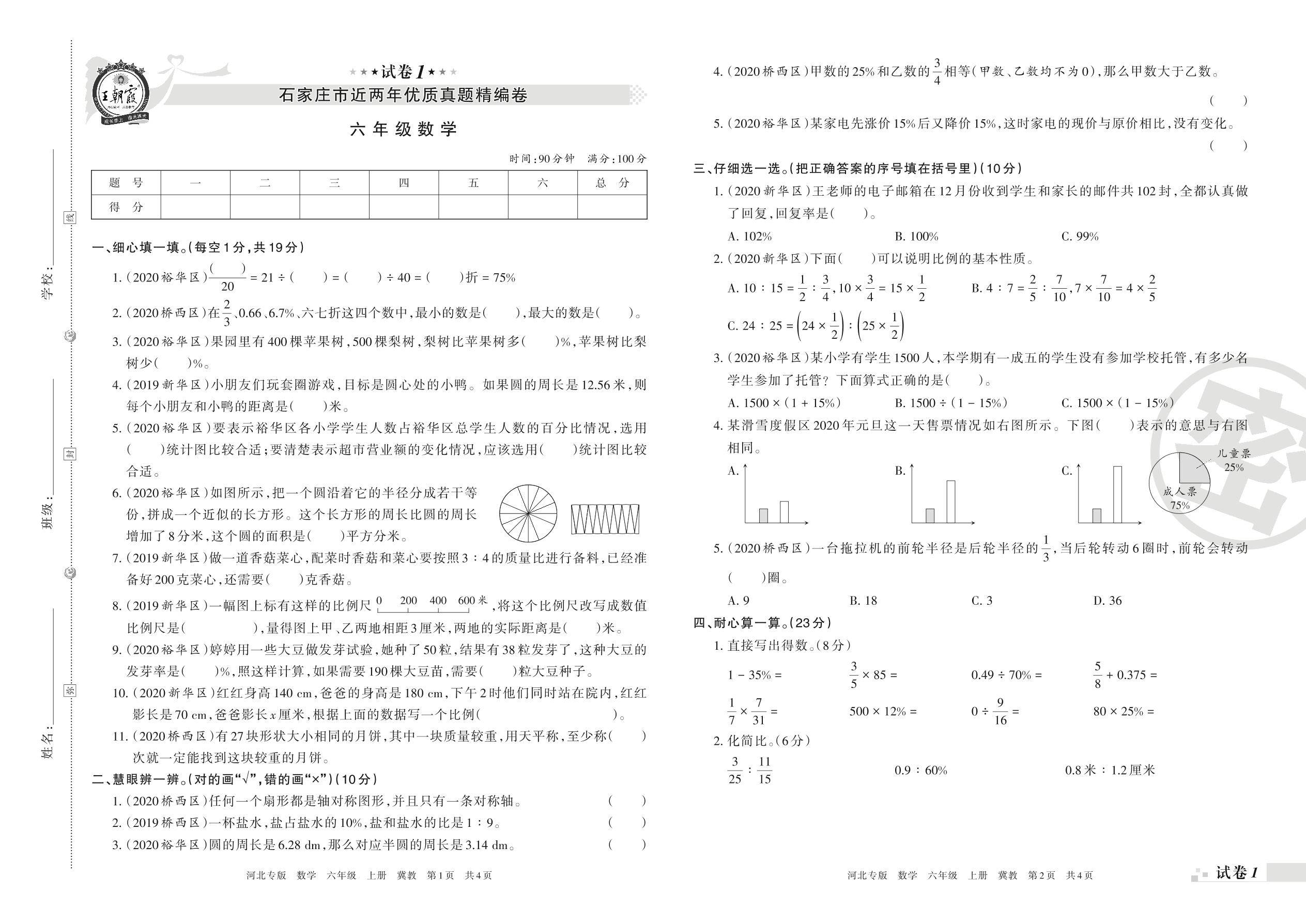 石家庄市近两年优质真题精编卷六年级上册数学(冀教版)【1】