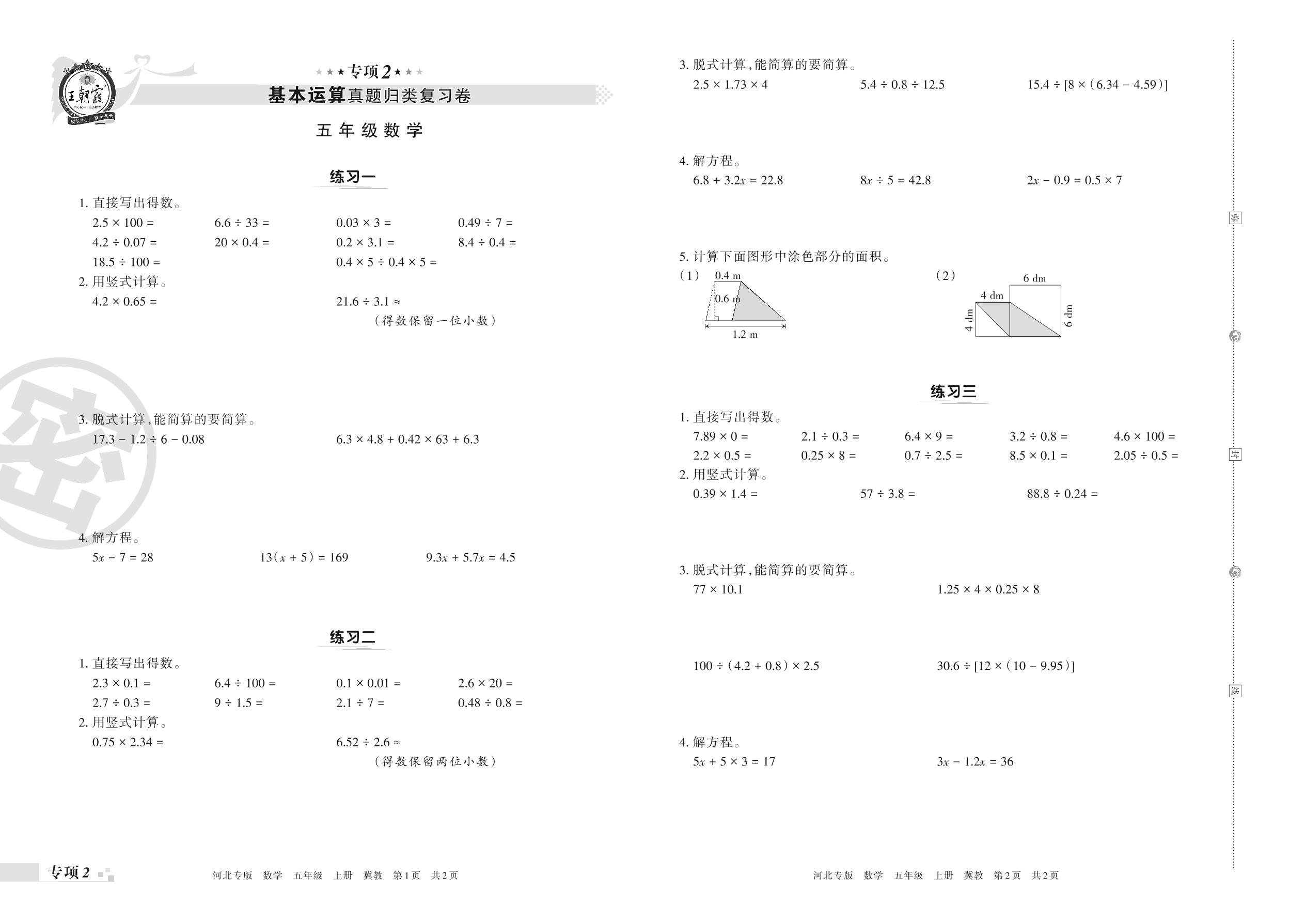 王朝霞期末专项卷——基本运算真题归类复习卷五年级上册数学(冀教版)【2】