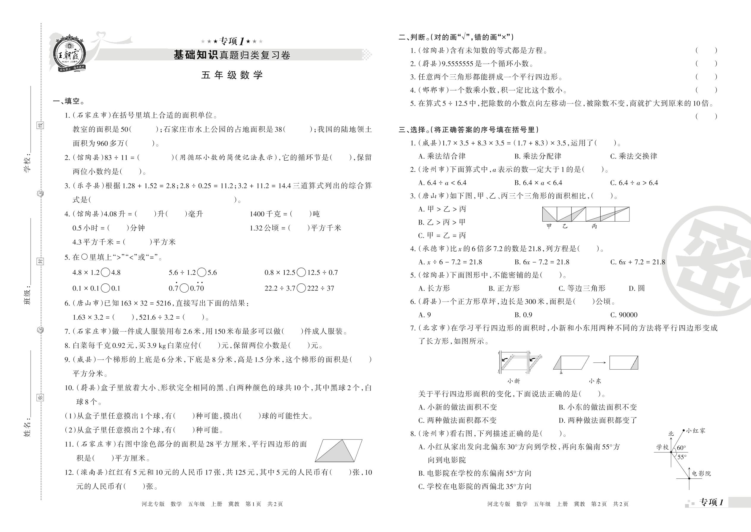 王朝霞期末专项卷——基础知识真题归类复习卷五年级上册数学(冀教版)【1】