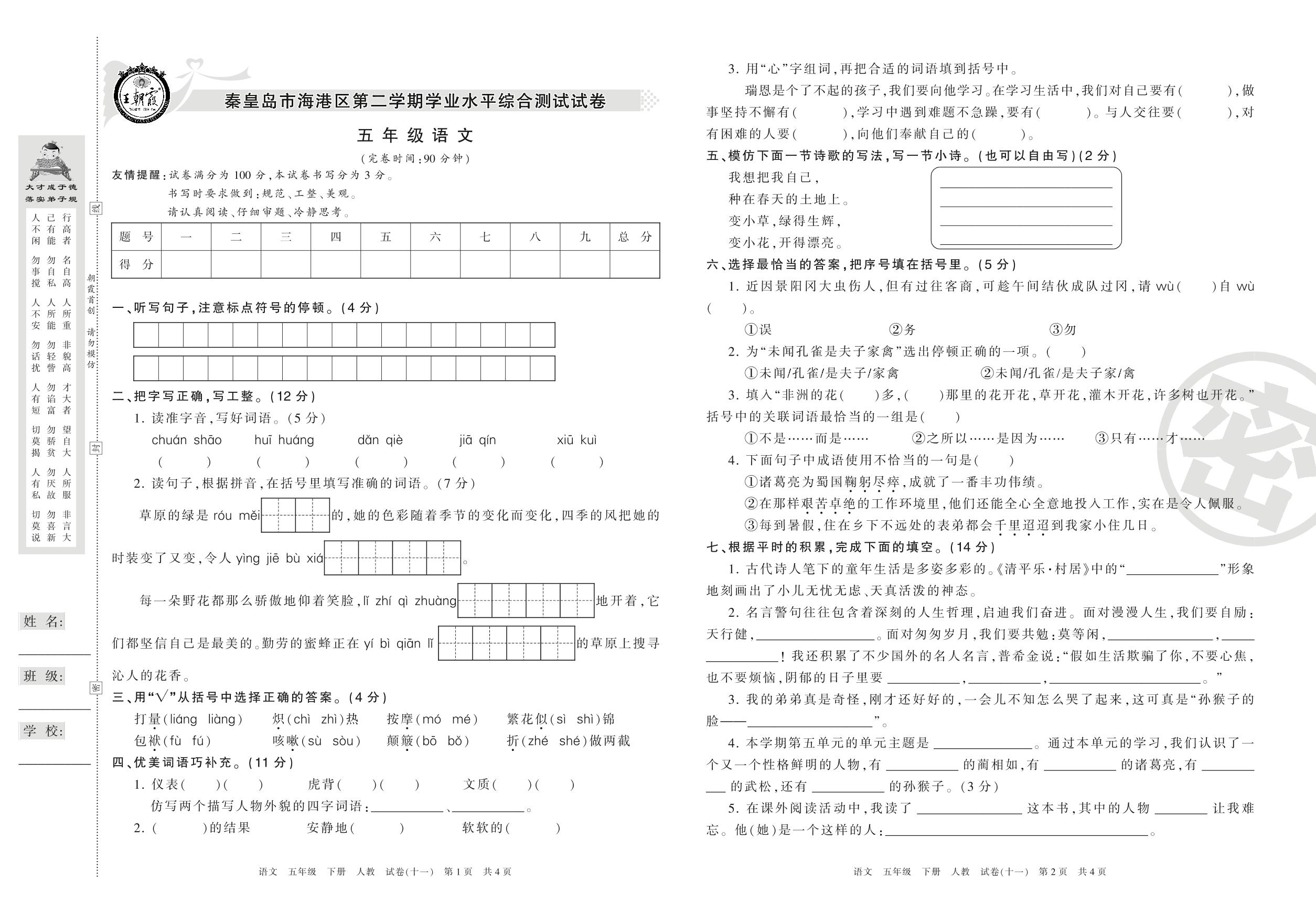 2015-2016学年第二学期秦皇岛市海港区五年级语文试卷(人教版)【11】