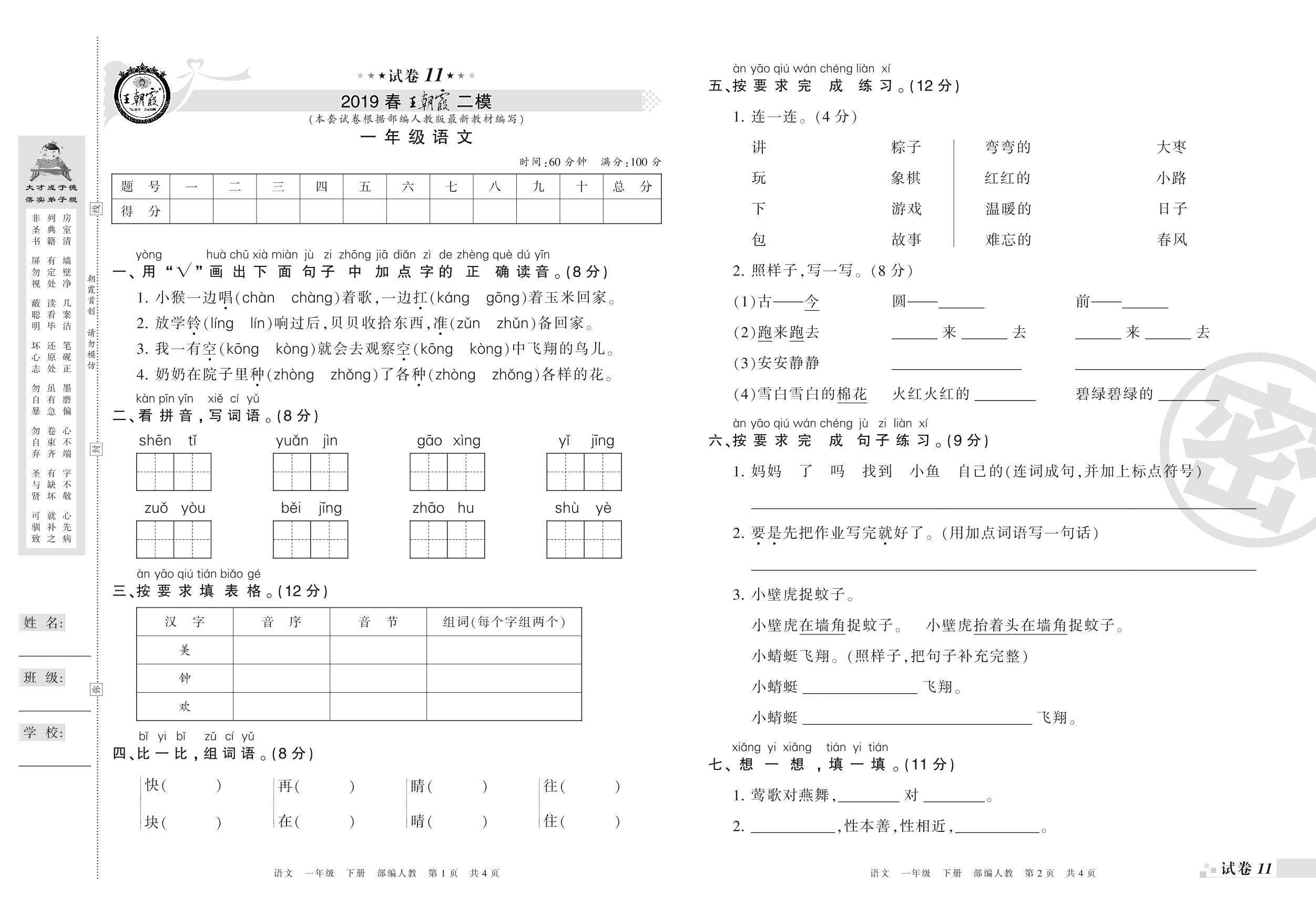王朝霞期末模拟卷一年级下册语文(人教版)_R210731181644【11】