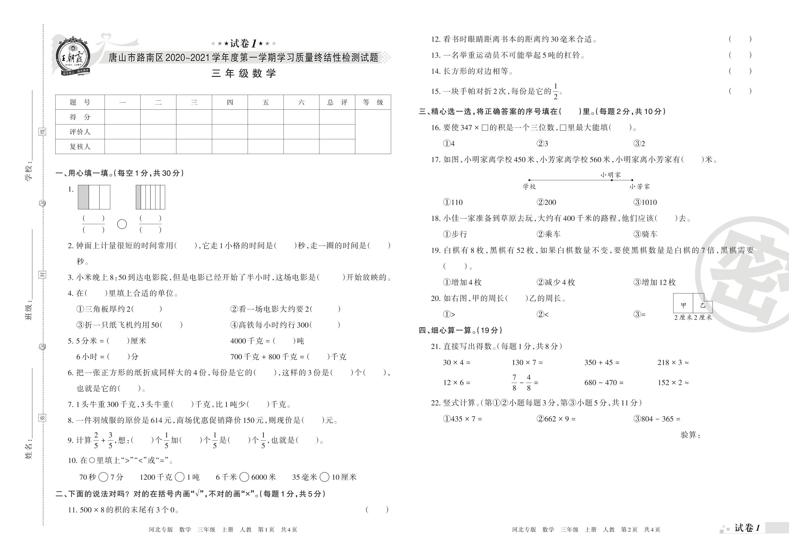 唐山市路南区2020~2021学年度第一学期学习质量终结性检测试题三年级数学(人教版)【1】