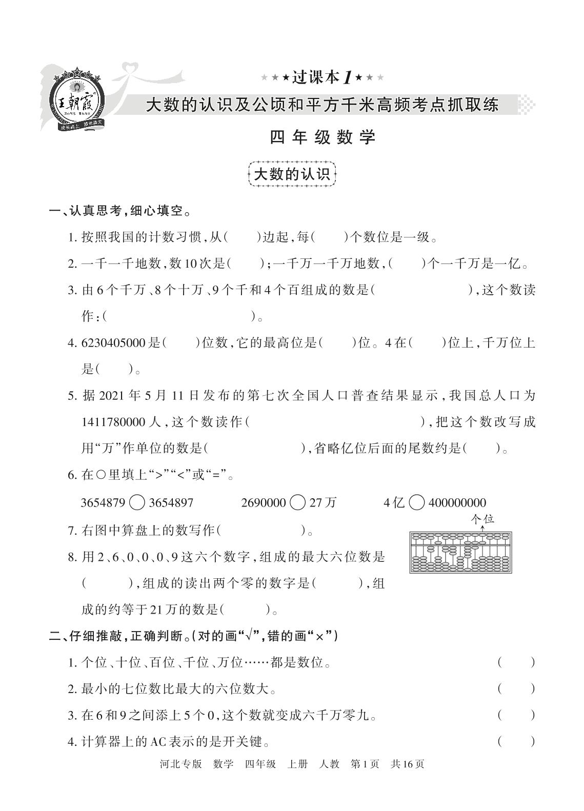 王朝霞期末过课本——大数的认识及公顷和平方千米高频考点抓取练四年级上册数学(人教版)_R211123091919537【1】