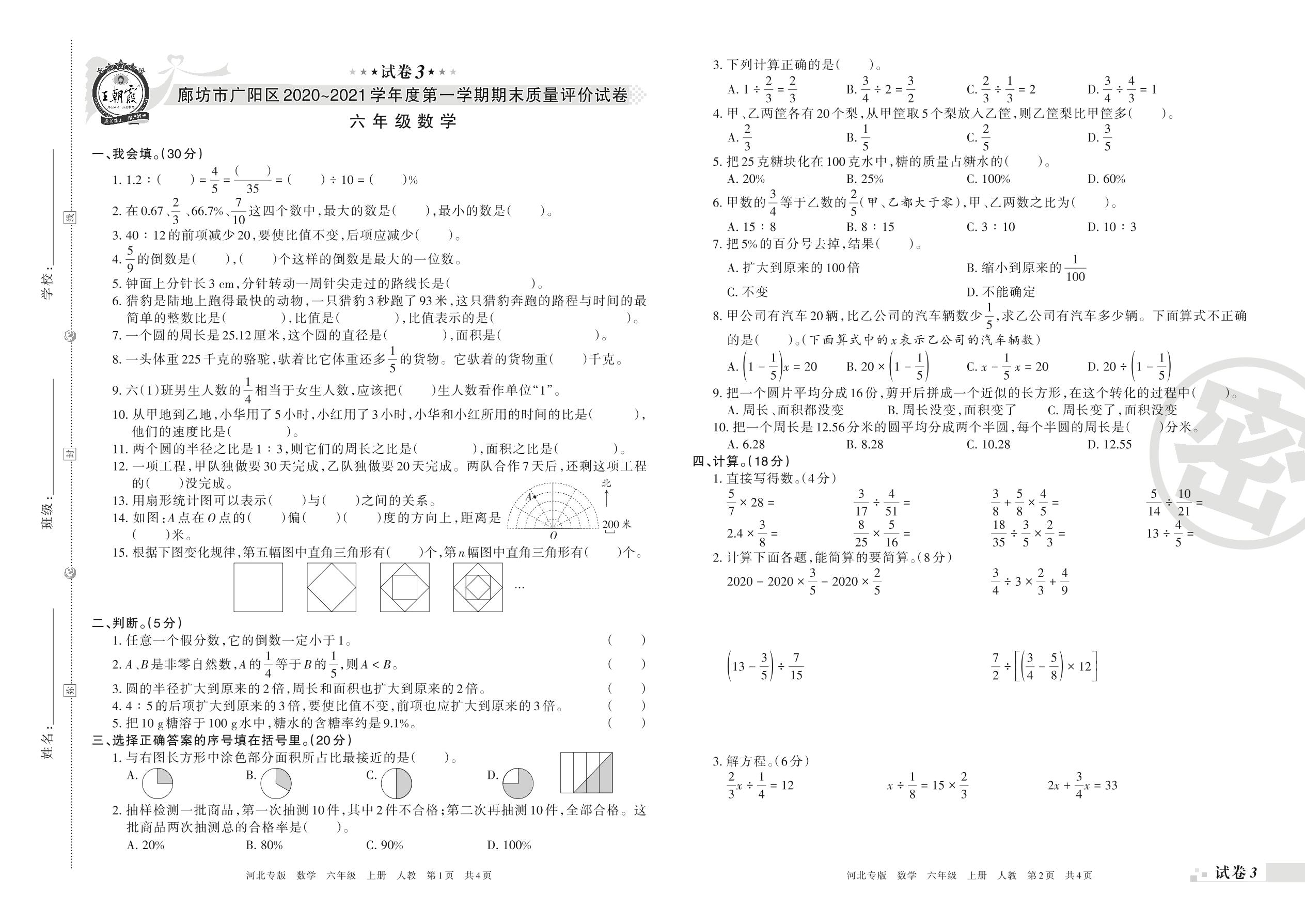 廊坊市广阳区2020~2021学年度第一学期期末质量评价试卷六年级数学(人教版)【3】