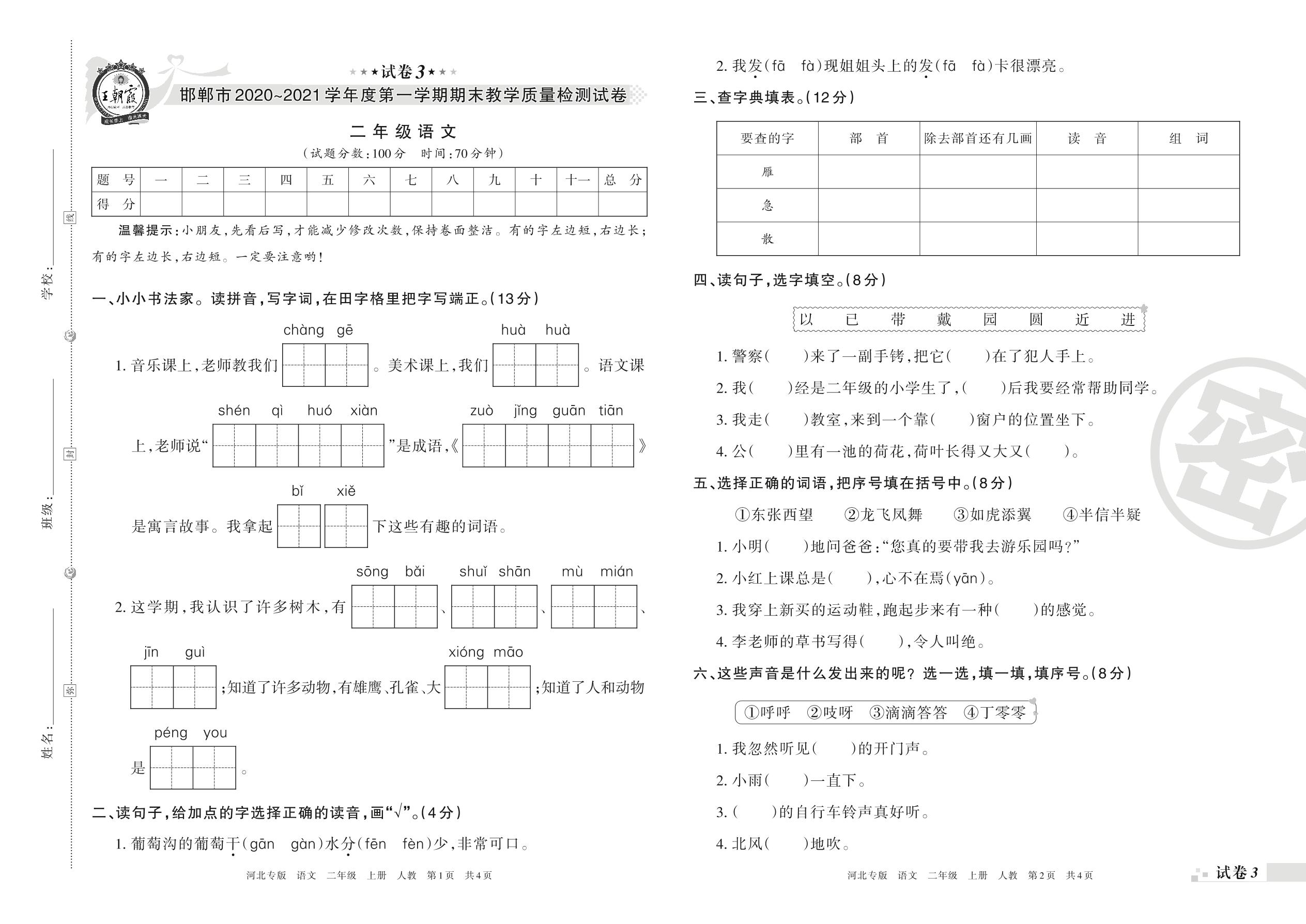 邯郸市2020~2021学年度第一学期期末教学质量检测试卷二年级语文(人教版)【3】