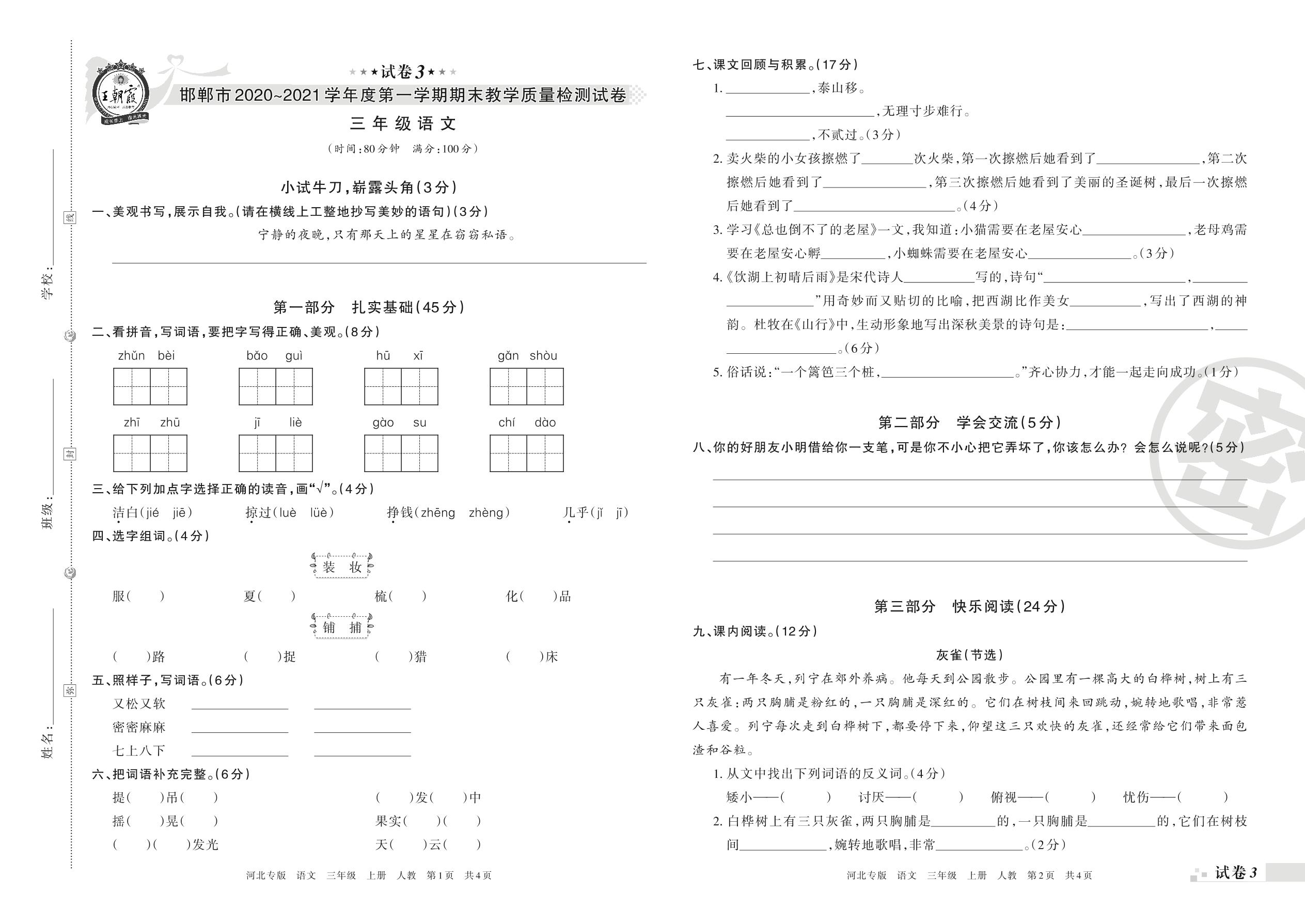 邯郸市2020~2021学年度第一学期期末教学质量检测试卷三年级语文(人教版)【3】