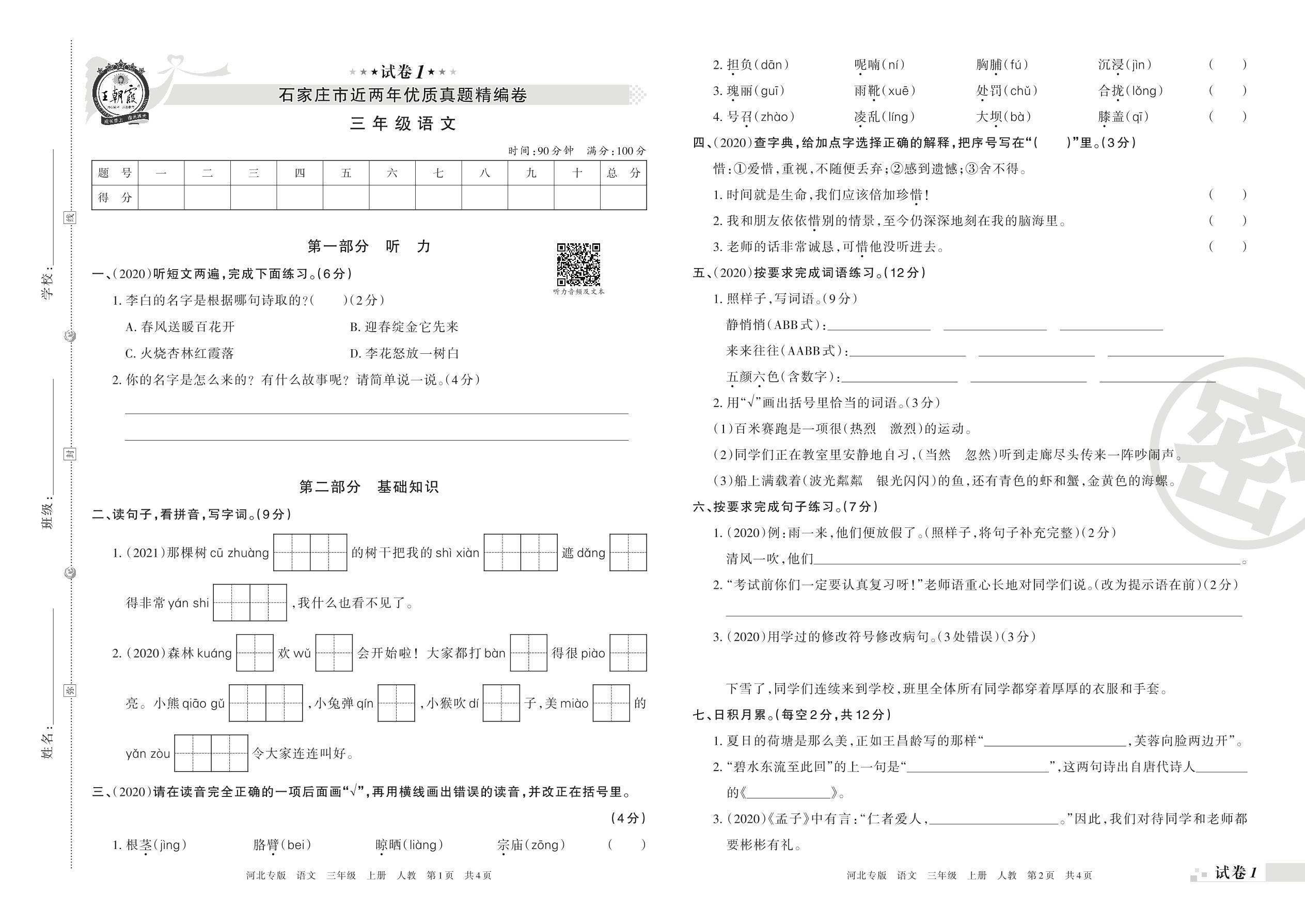 石家庄市近两年优质真题精编卷三年级上册语文(人教版)【1】
