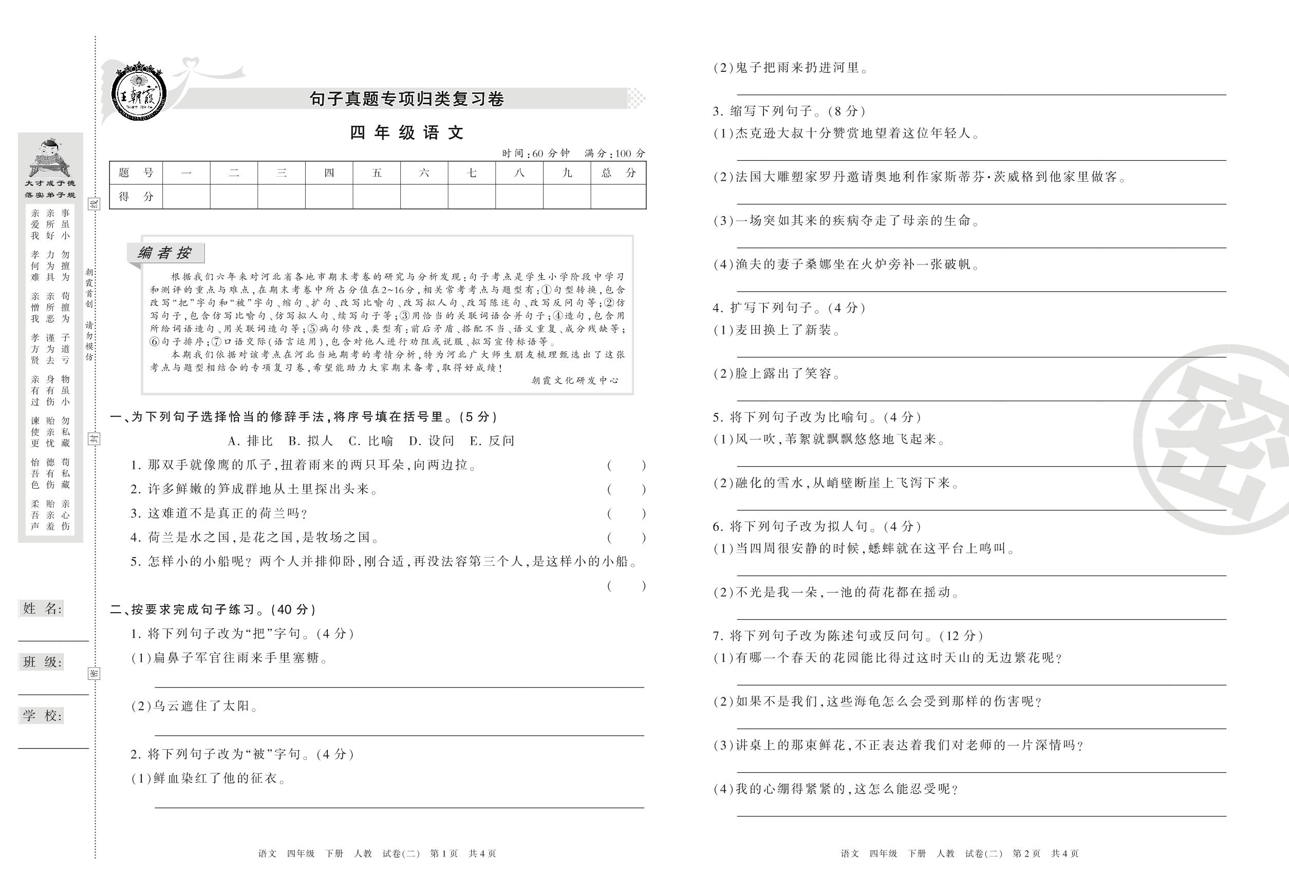 王朝霞期末专项卷四年级下册语文(人教版)_R210801203522【2】