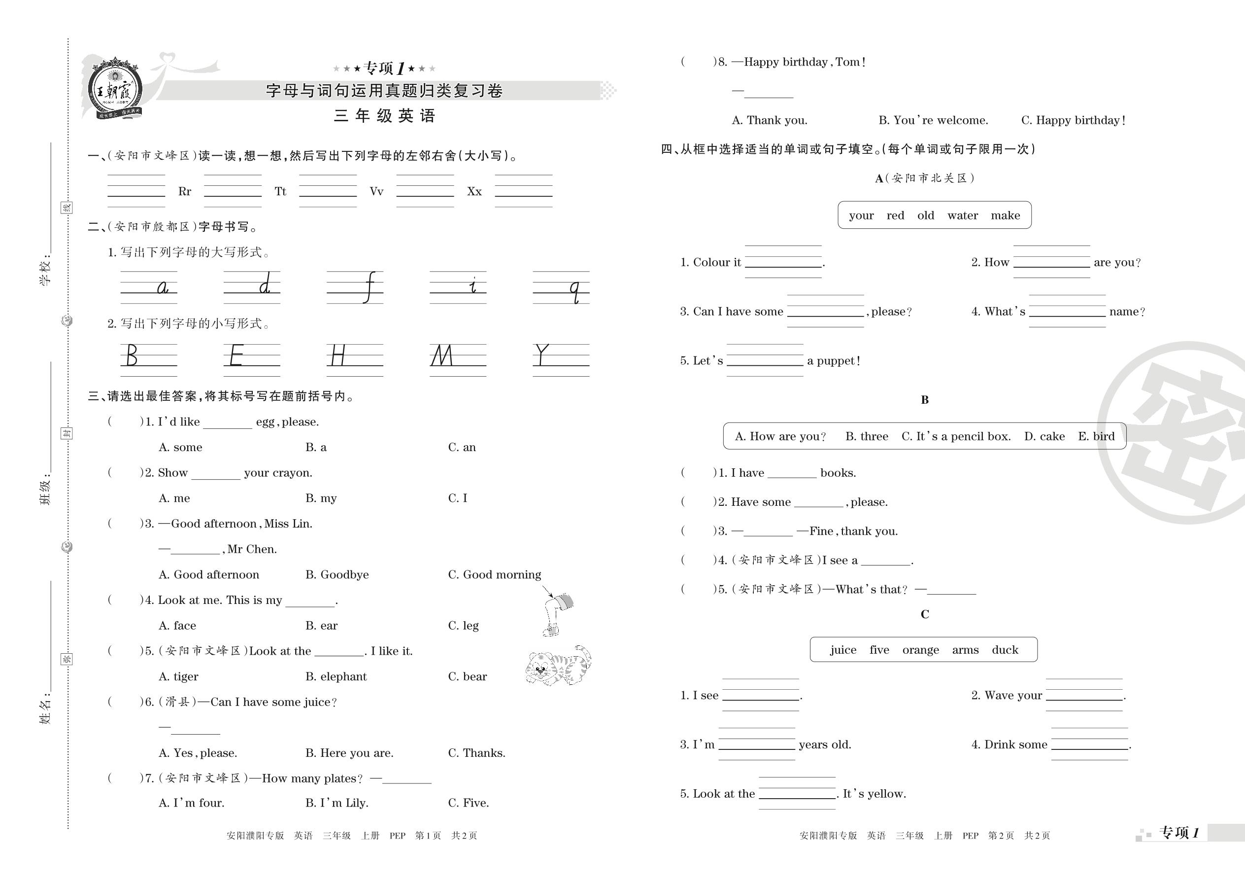王朝霞期末专项卷——字母与词句运用真题归类复习卷三年级上册英语(人教PEP版)【1】