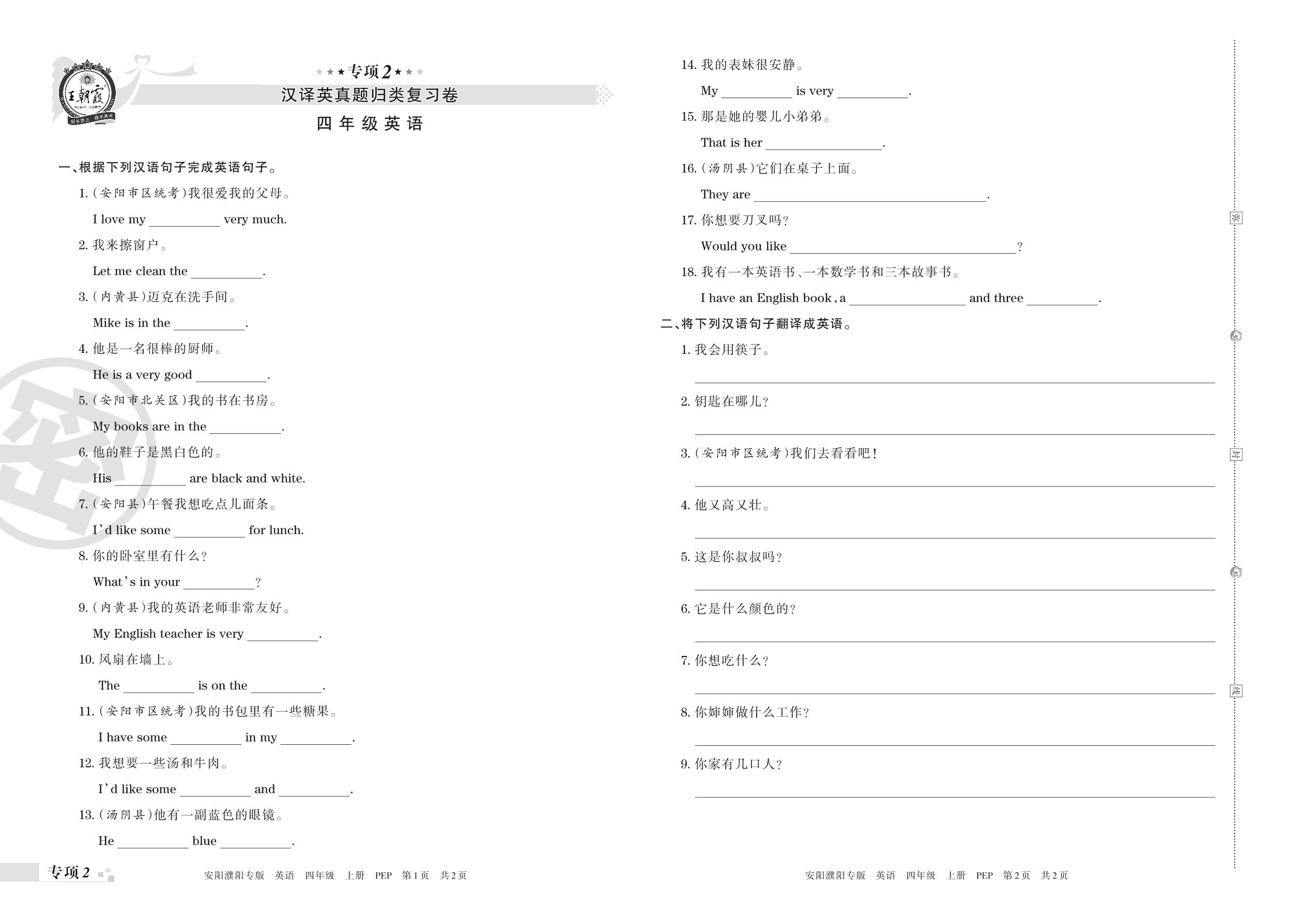王朝霞期末专项卷——汉译英真题归类复习卷四年级上册英语(人教PEP版)【2】