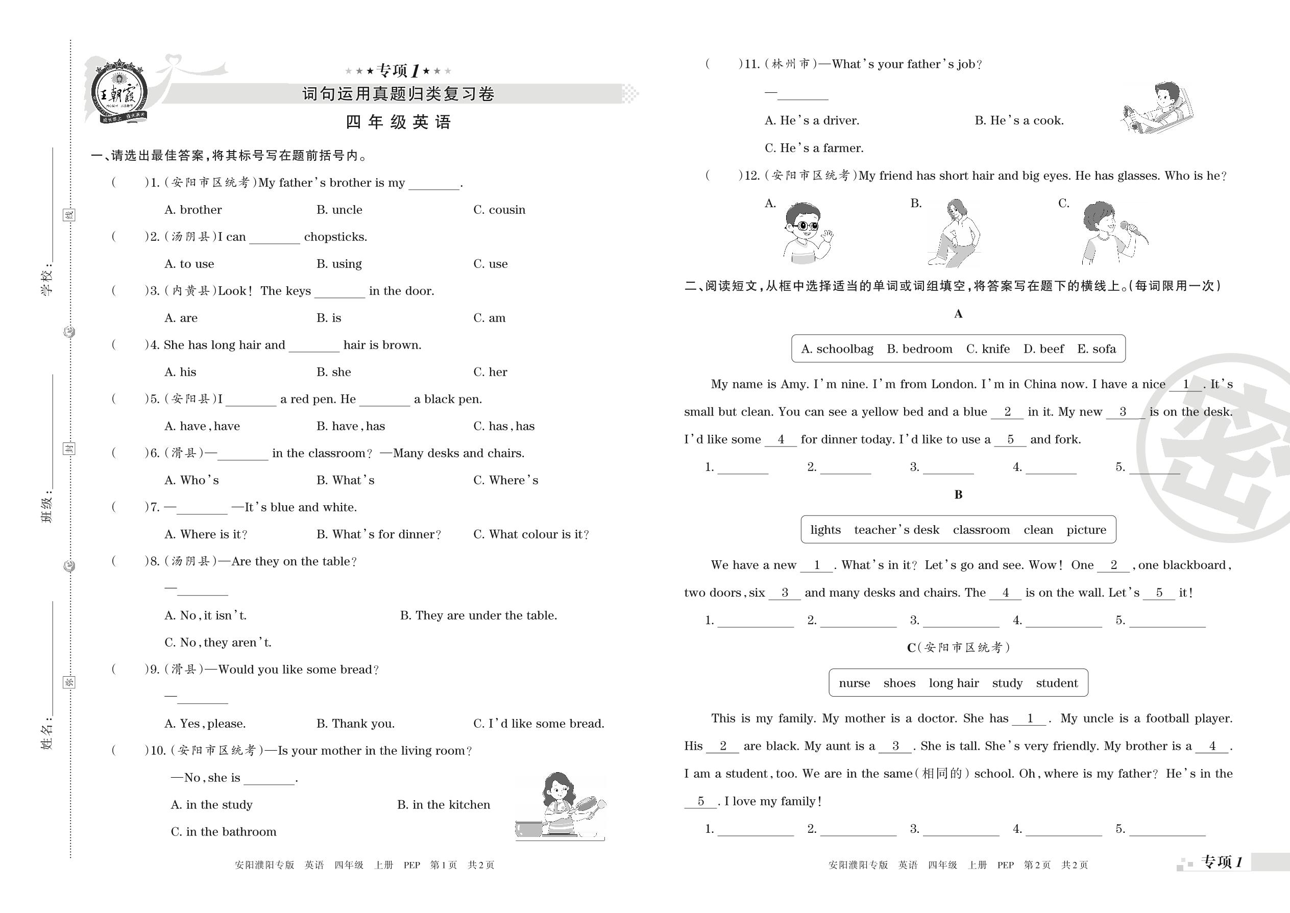 王朝霞期末专项卷——词句运用真题归类复习卷四年级上册英语(人教PEP版)【1】