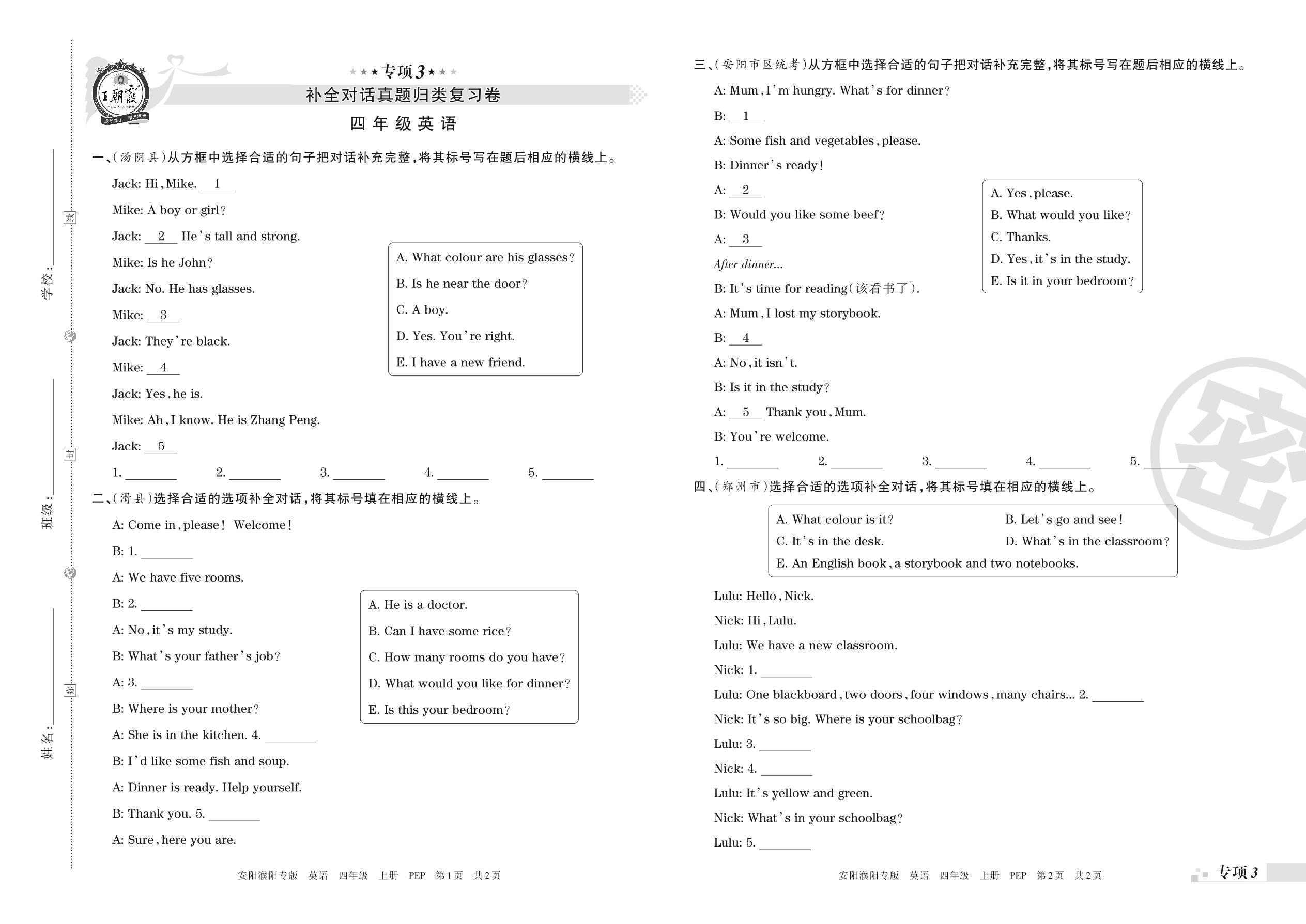 王朝霞期末专项卷——补全对话真题归类复习卷四年级上册英语(人教PEP版)【3】