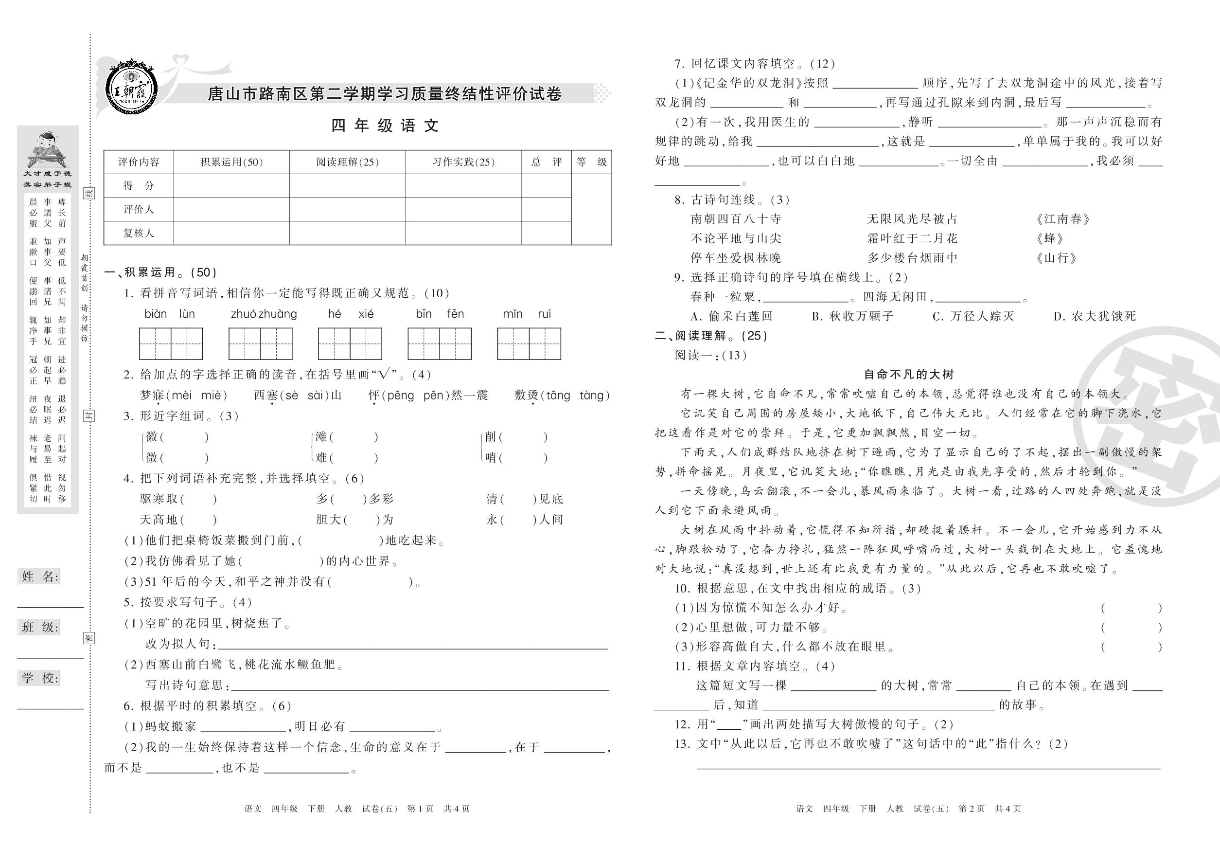 2015-2016学年第二学期唐山市路南区四年级语文试卷(人教版)【5】