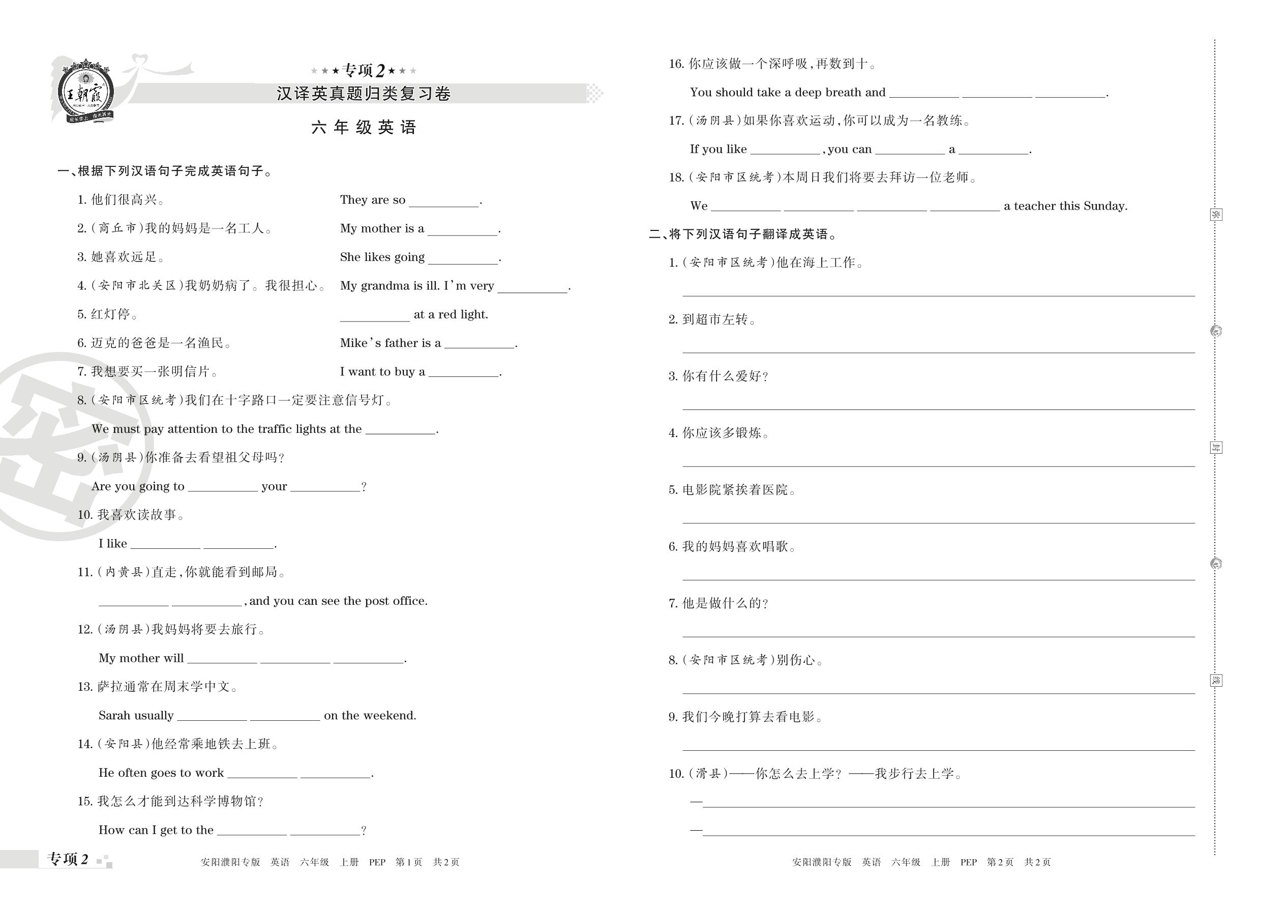 王朝霞期末专项卷——汉译英真题归类复习卷六年级上册英语(人教PEP版)【2】