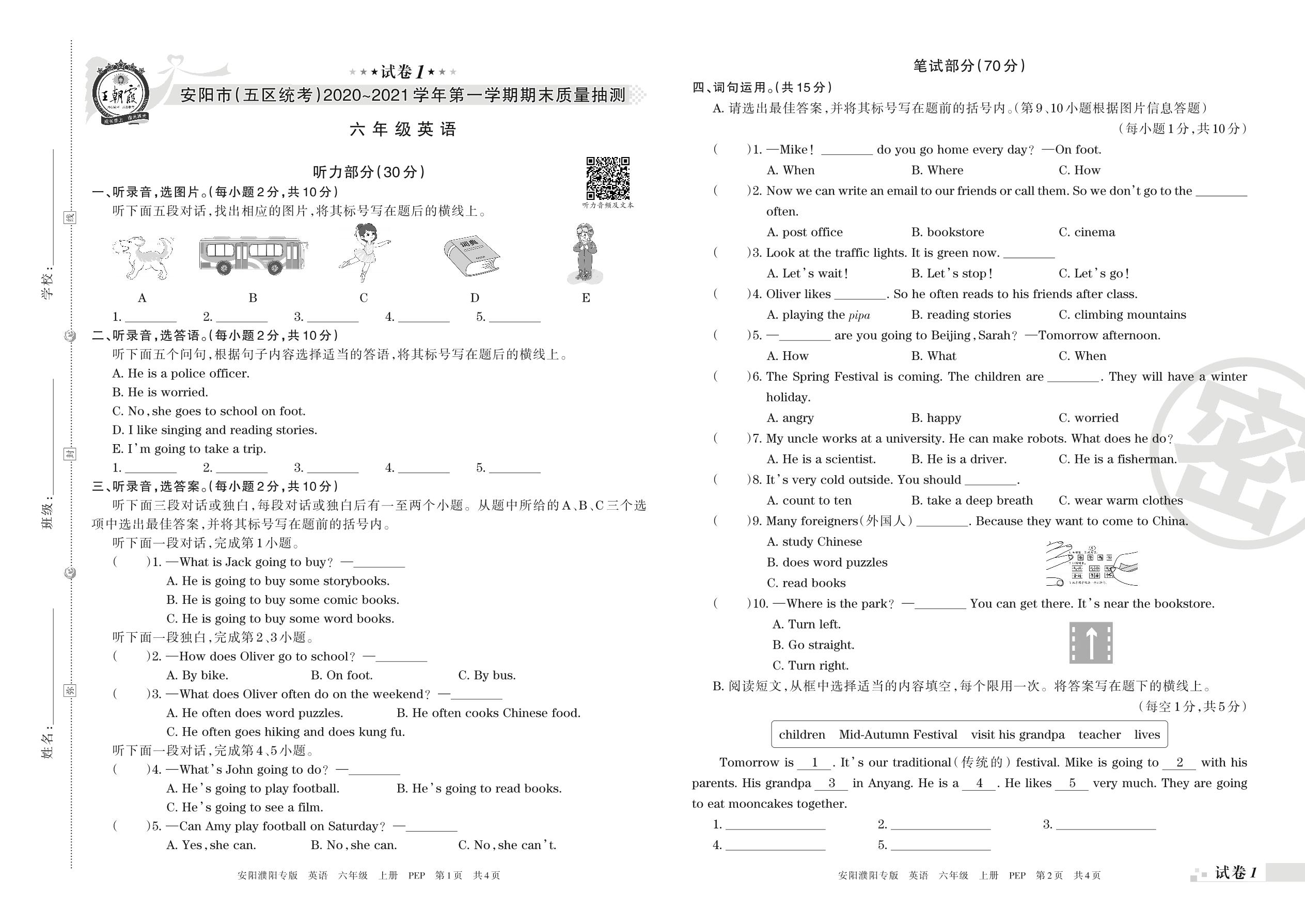安阳市(五区统考)2020~2021学年第一学期期末质量抽测六年级英语(人教PEP版)【1】