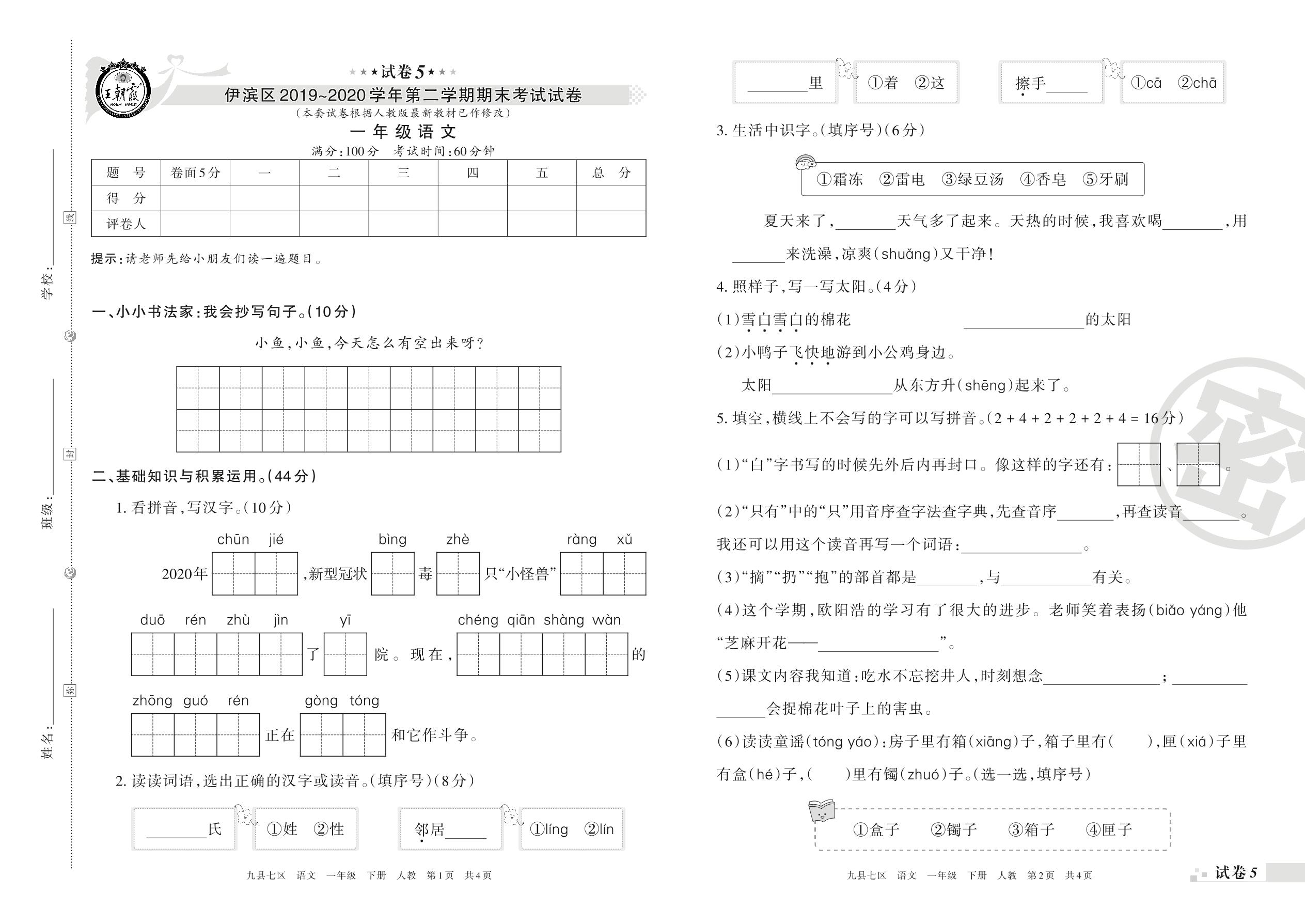 2019-2020学年第二学期洛阳市伊滨区一年级语文试卷(人教版)【5】